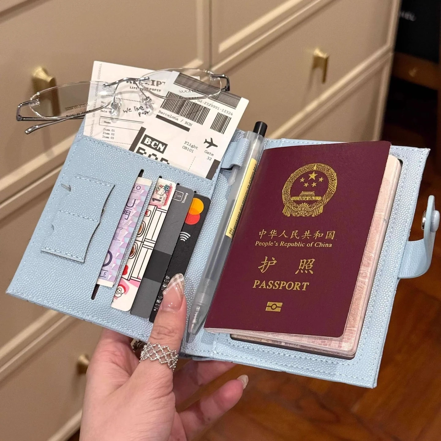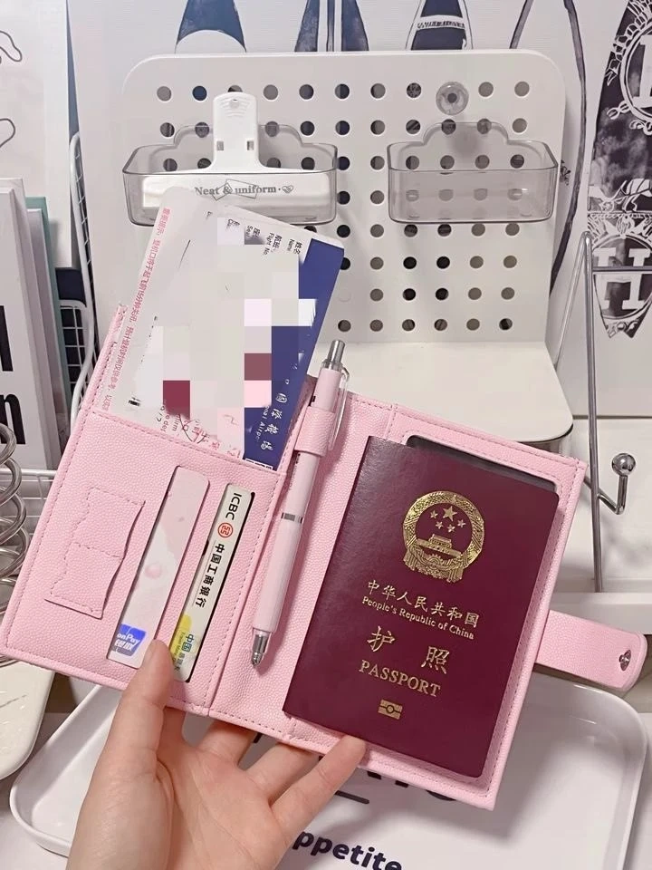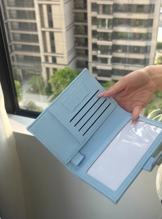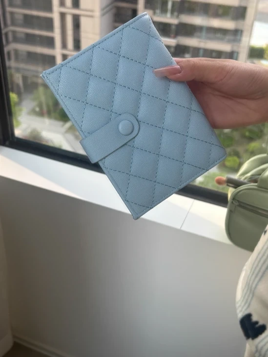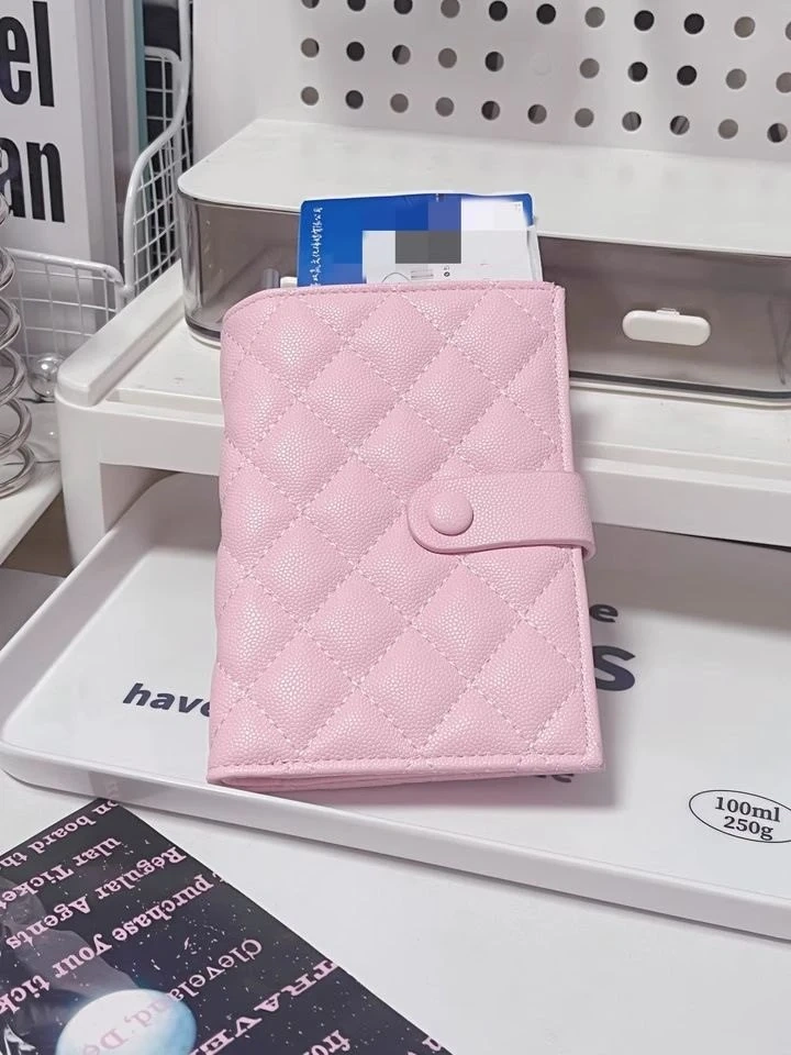 This passport holder features a quilted design and a snap closure. It has multiple card slots and a clear window. It's great for keeping your travel documents organized!