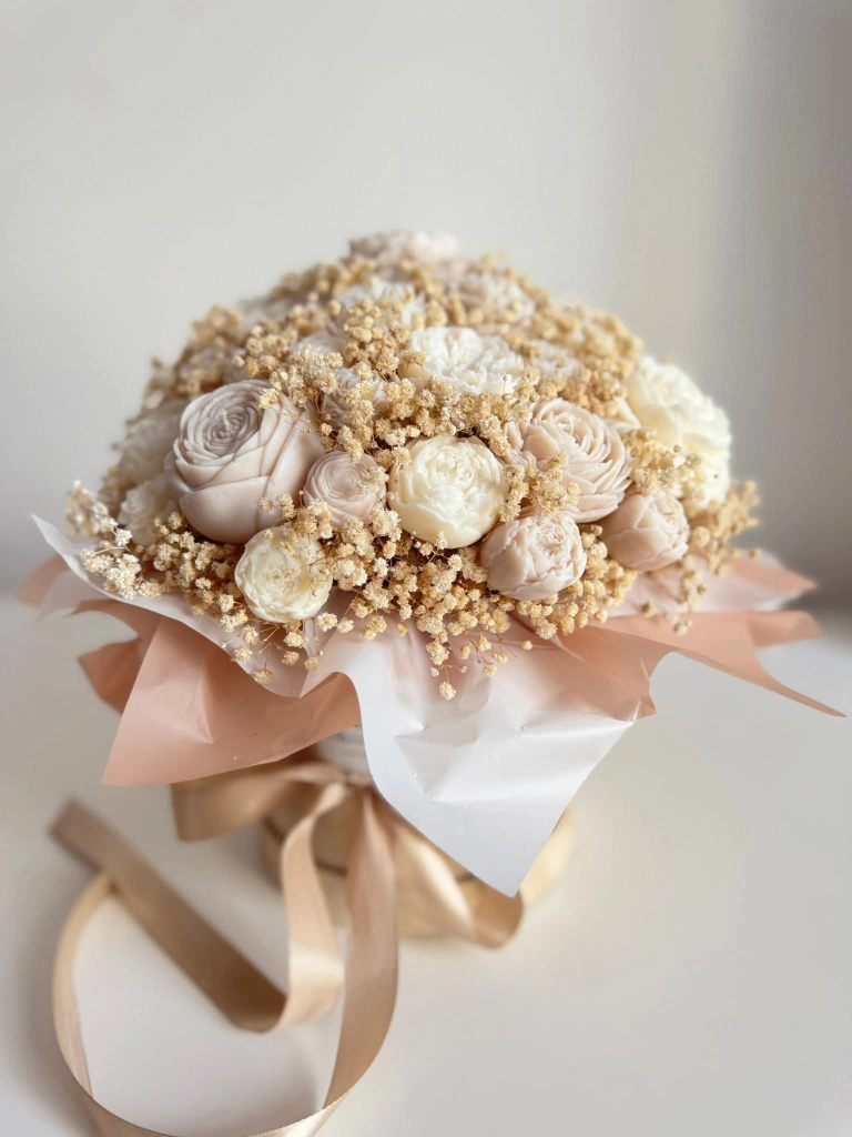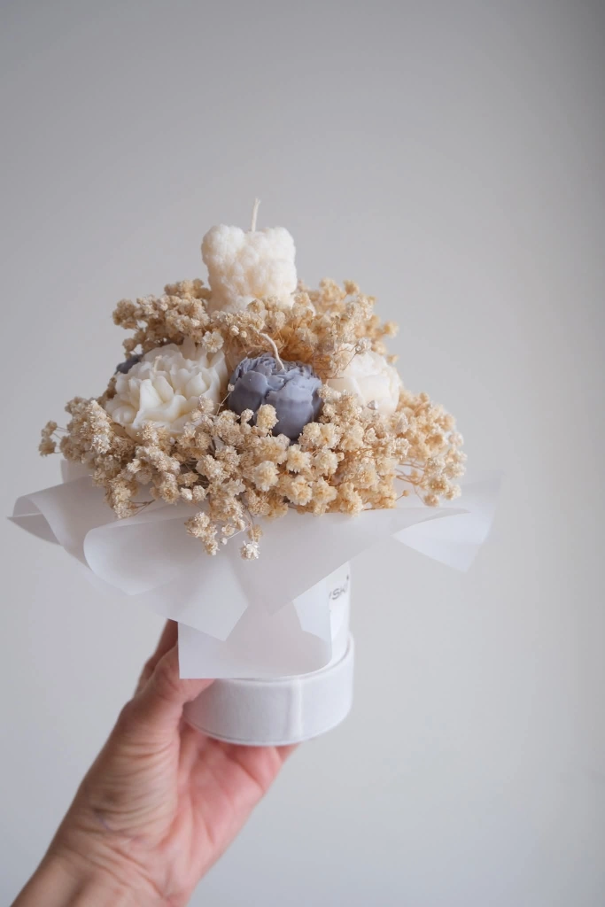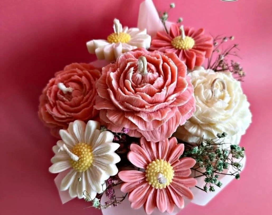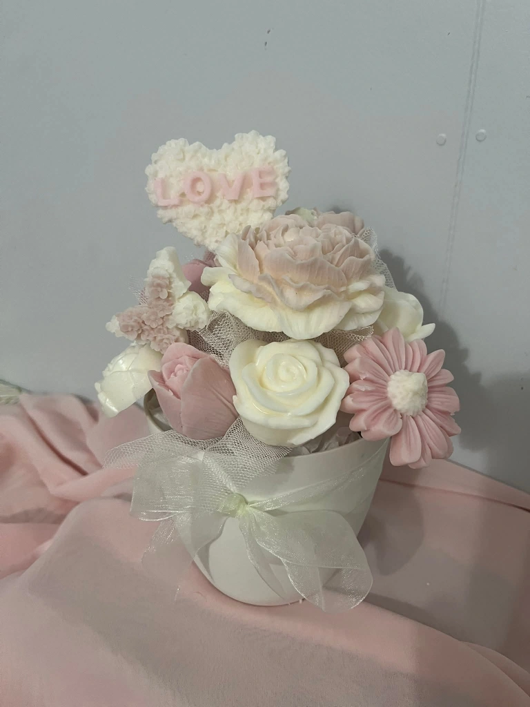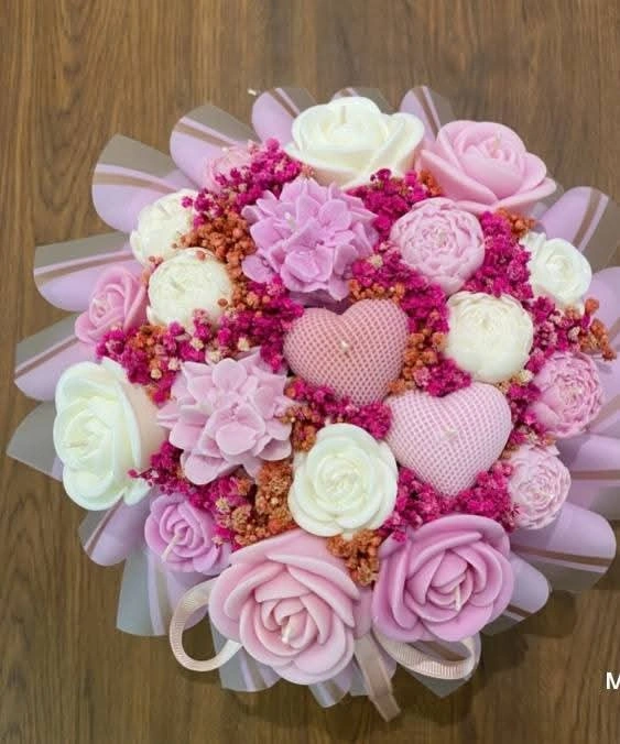 A lovely collection of handmade scented candles. These decorative pieces include beautifully crafted roses and adorable teddy bears holding hearts. They're perfect for adding a touch of charm to any space or as a thoughtful gift. Crafted from quality wax with delicate scents.
