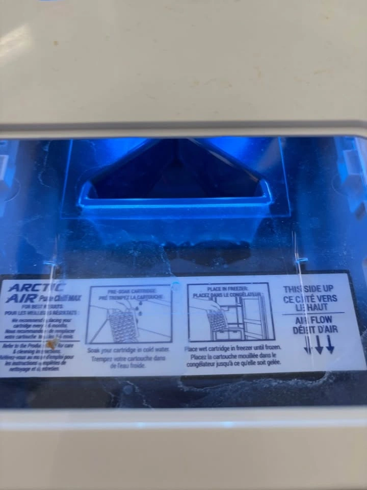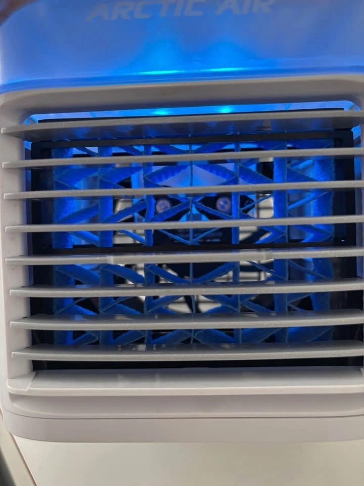 Compact personal space cooler. Arctic Air Pure Chill MAX model. Has blue LED lights and multiple fan speeds. Good for desk cooling. You can add water or freeze an ice pack in it.