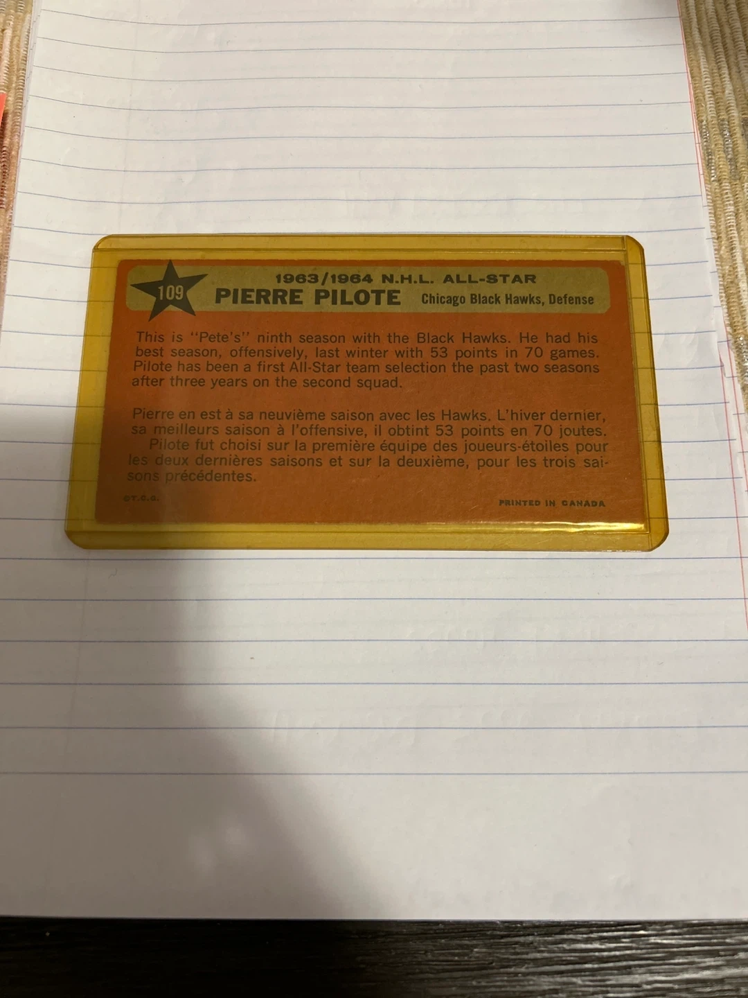 This is a 1963/1964 N.H.L. All-Star Pierre Pilote hockey card. Pierre Pilote played defense for the Chicago Black Hawks. Printed in Canada.