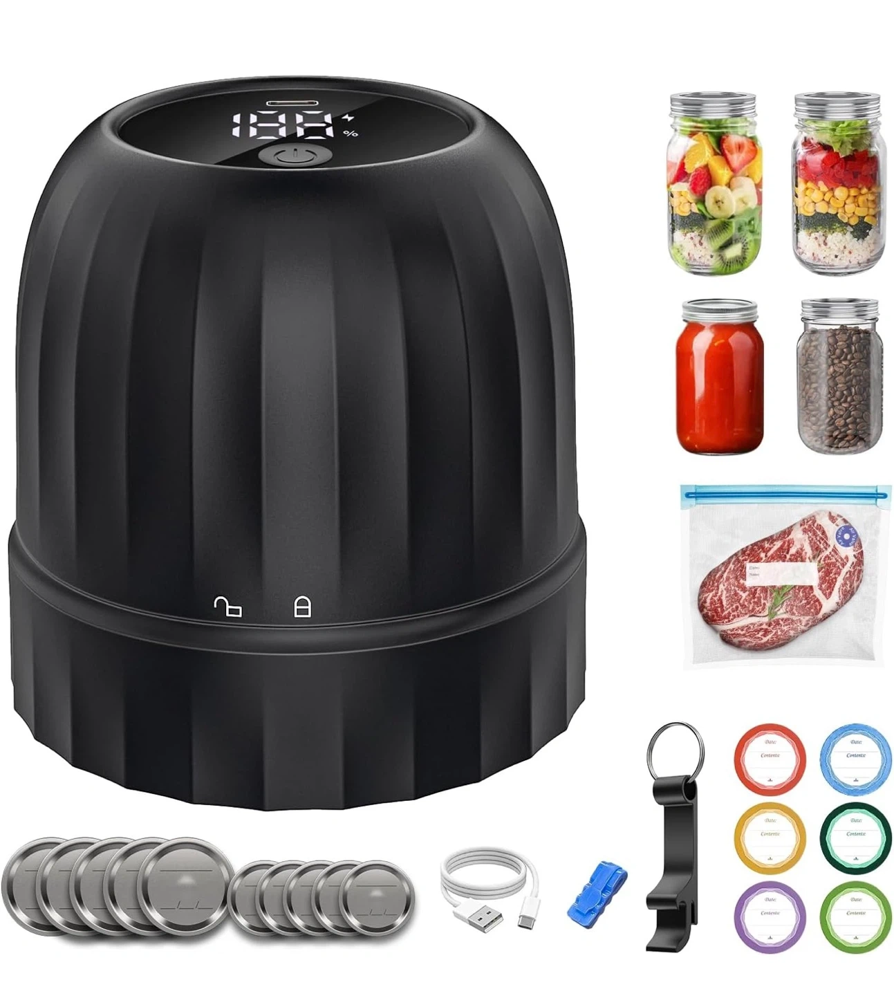 Keep your goods fresher for longer with this electric mason jar vacuum sealer kit! It's perfect for sealing jars and bags, and it comes with everything you need to get started. The kit includes the vacuum sealer, jar lids, bag clips, and a USB charging cable