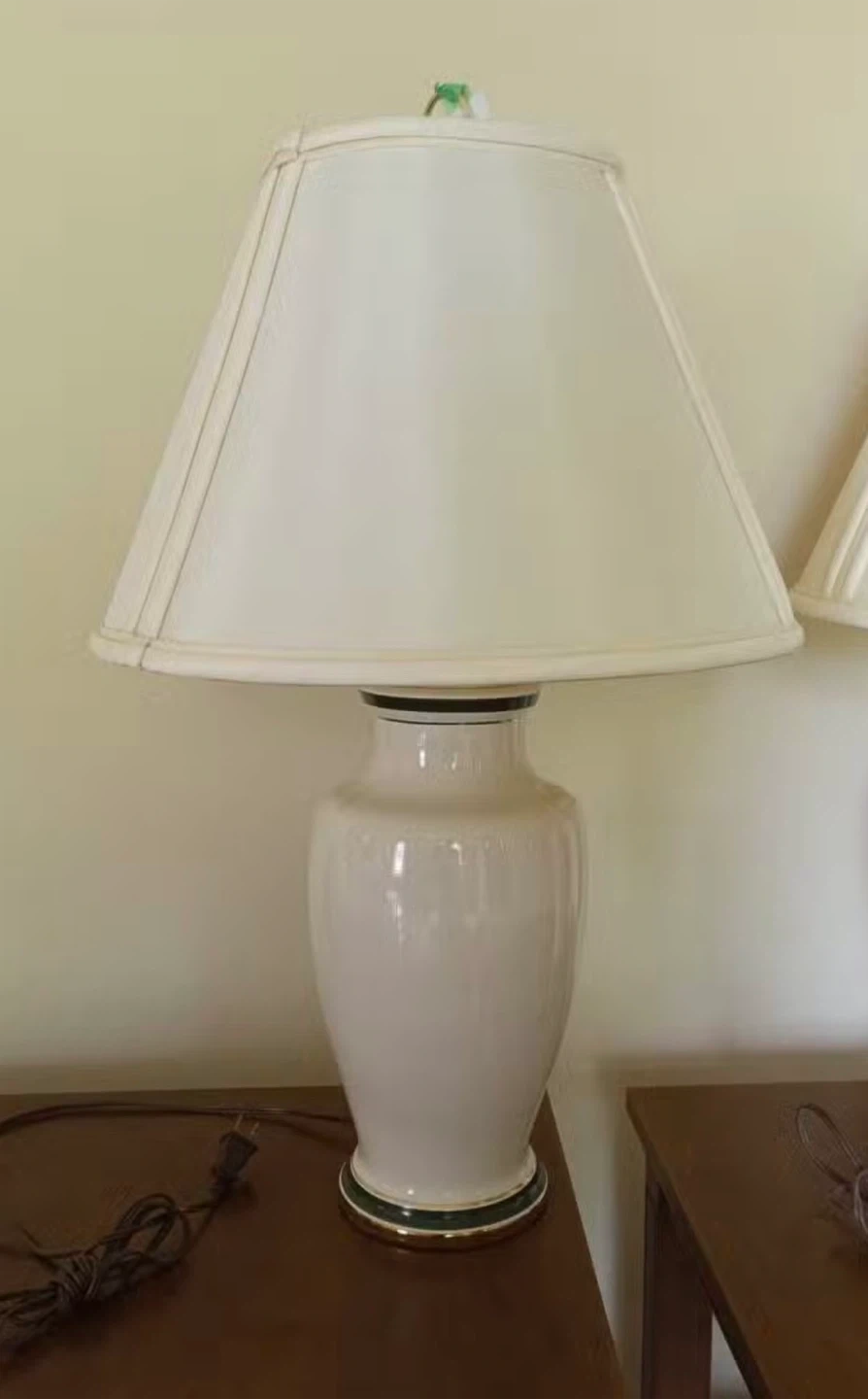 This is a white ceramic table lamp with a cream-coloured shade. It has a dark green band around the base with gold trim. It's a classic design that'll fit any room. Creates a warm ambiance.