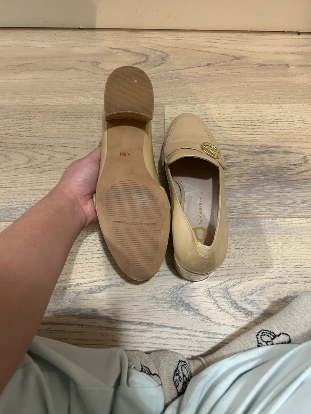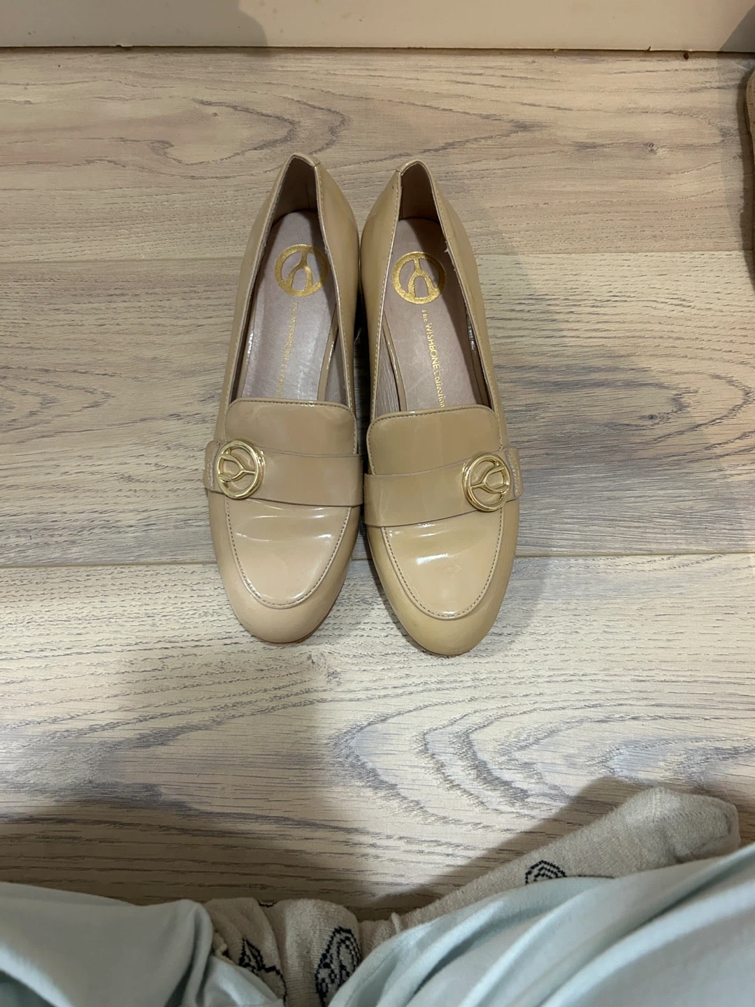 These are patent leather loafers from The Wishbone Collection. They feature a gold-tone hardware detail on the vamp. The heel height is approximately 1.5 inches.