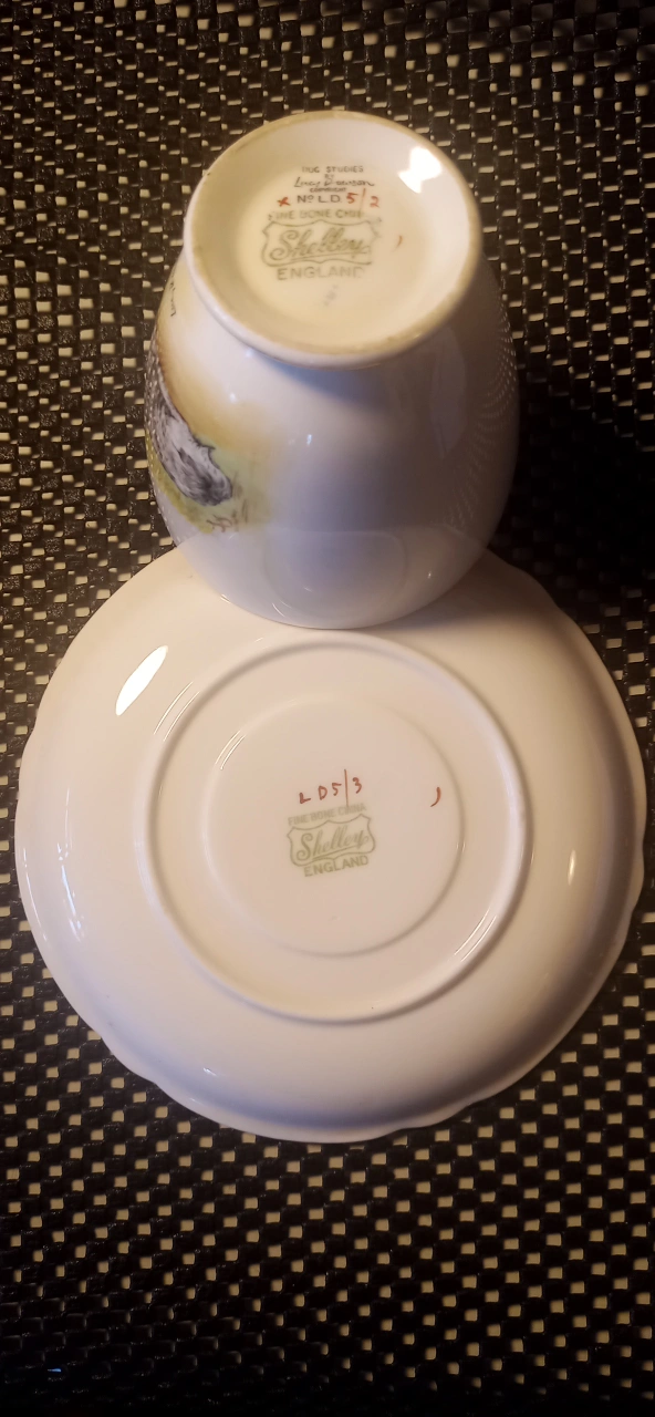 This is a Shelley Fine Bone China tea cup and saucer from the 1930s. It features a painted dog design and gold trim. There was 4 styles made and this is the number 2. Very limited set. The cheapest I have seen it is $700. and I'm not kidding. Please research for yourself! It's a lovely addition to any tea collection! In like new condition.