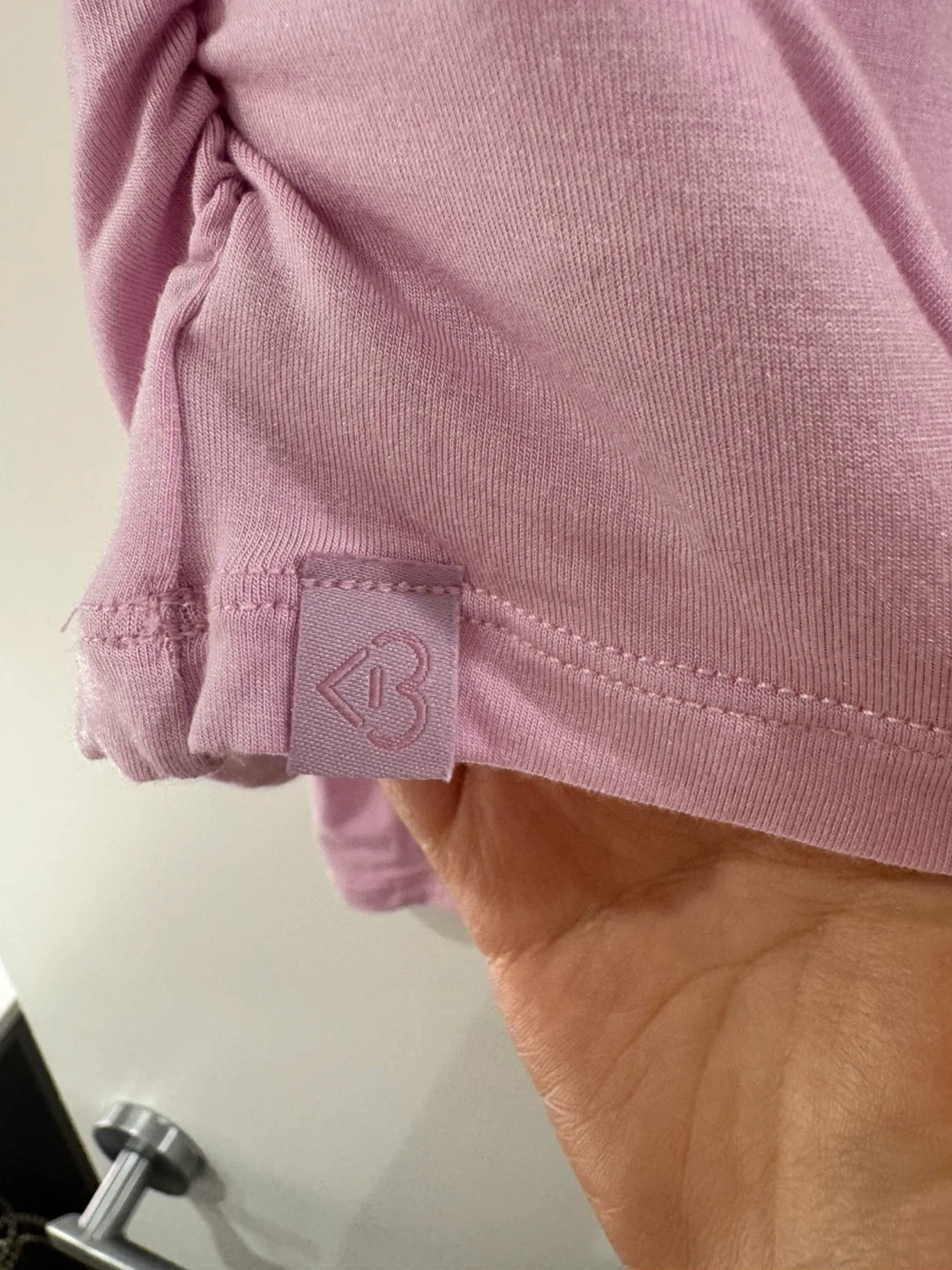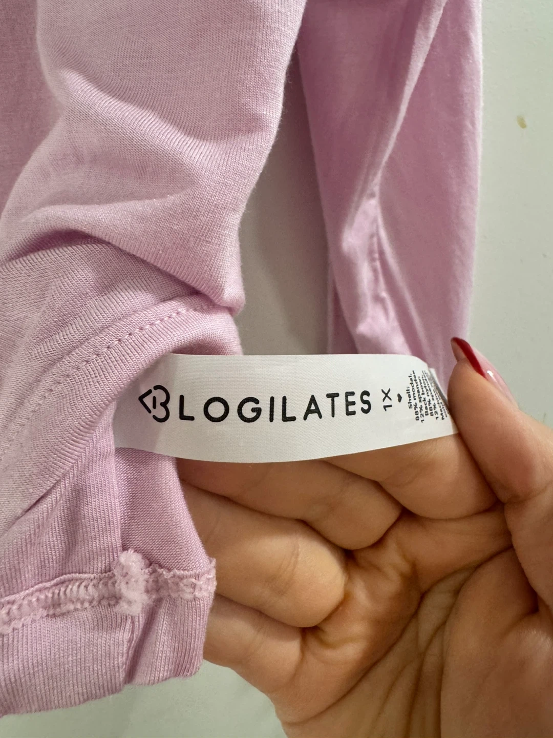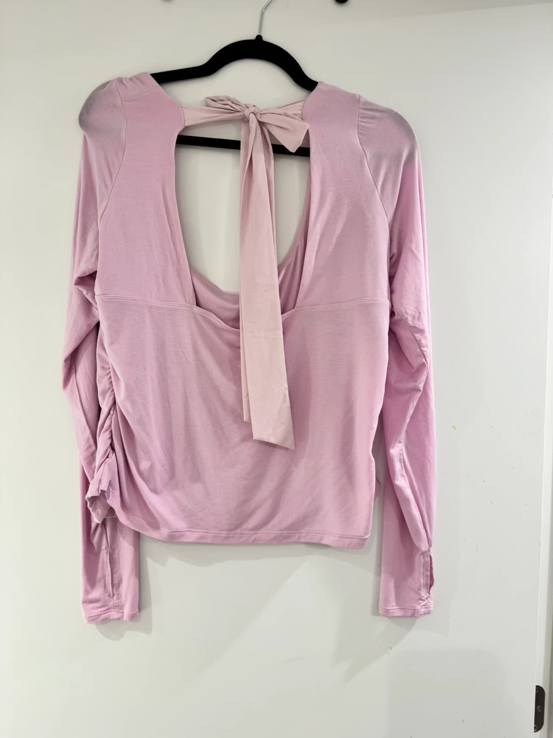 This is a cute pink long-sleeve top from Blogilates. It features ruching on the sides and a tie-bow detail at the back. Made from a blend of polyester and spandex for comfort.
