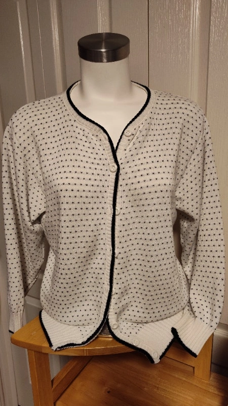 Ladies white with black accents cardigan sweater retro style.