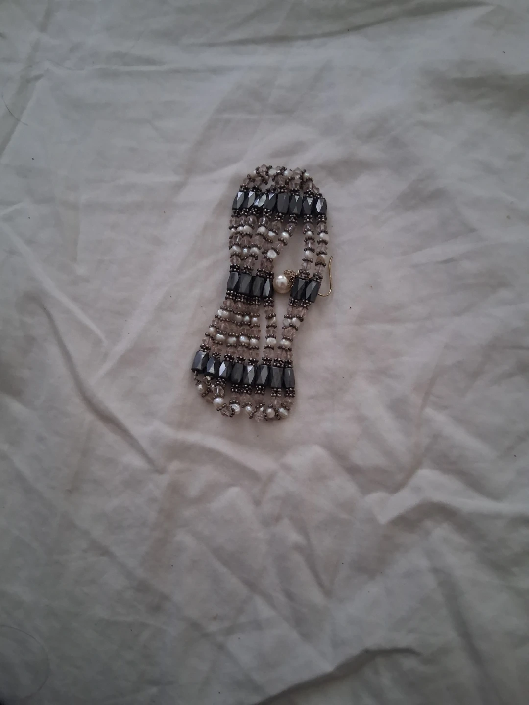 This bracelet features multiple strands of hematite beads, small clear beads, and faux pearls. It has a clasp closure with a single pearl accent. It's a lovely accessory for everyday wear.