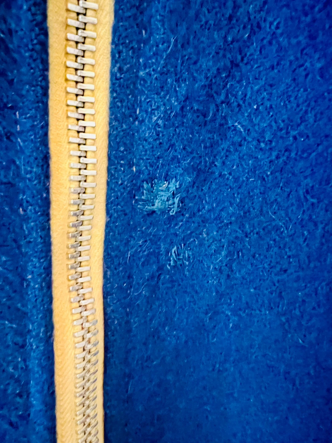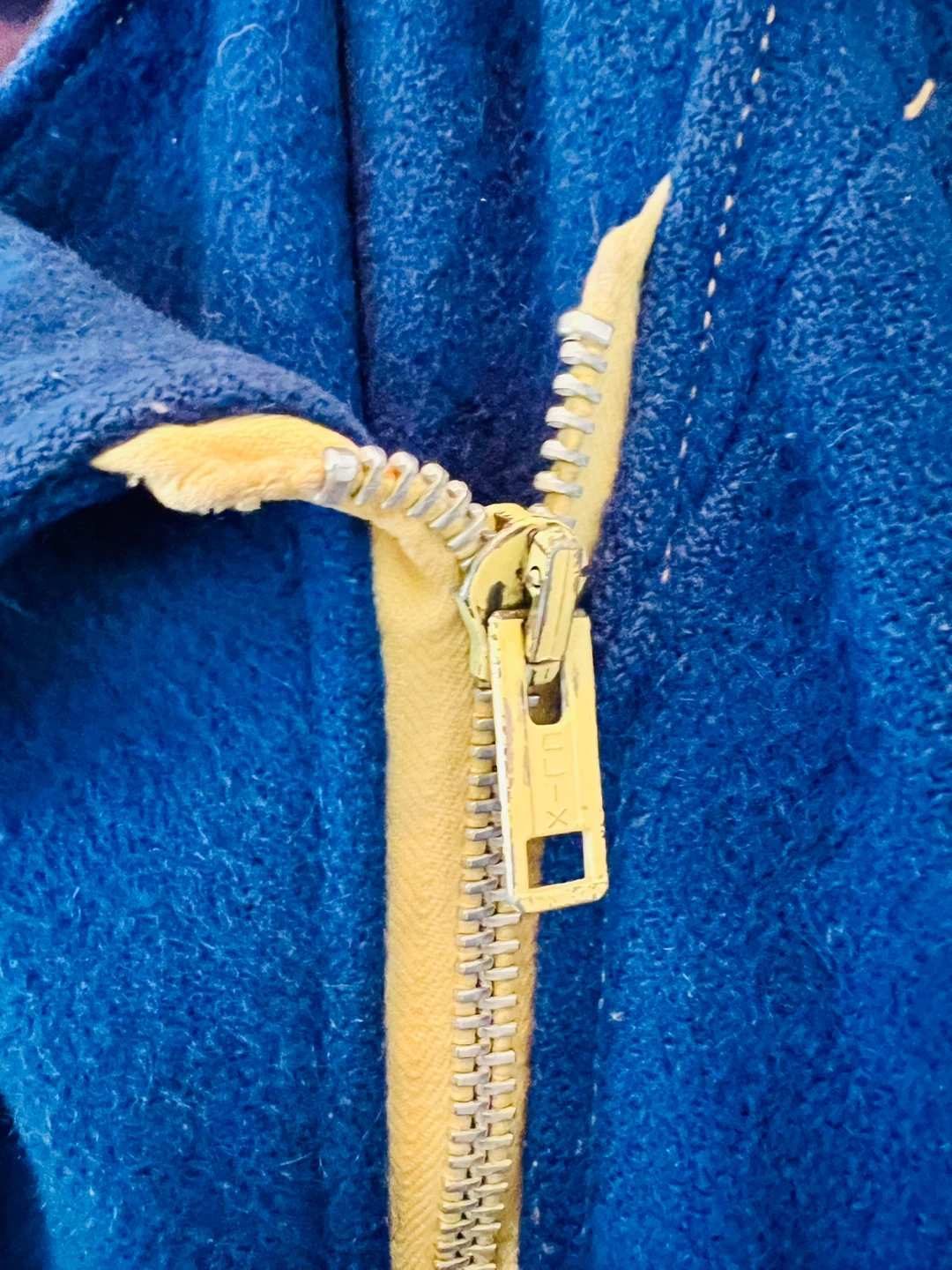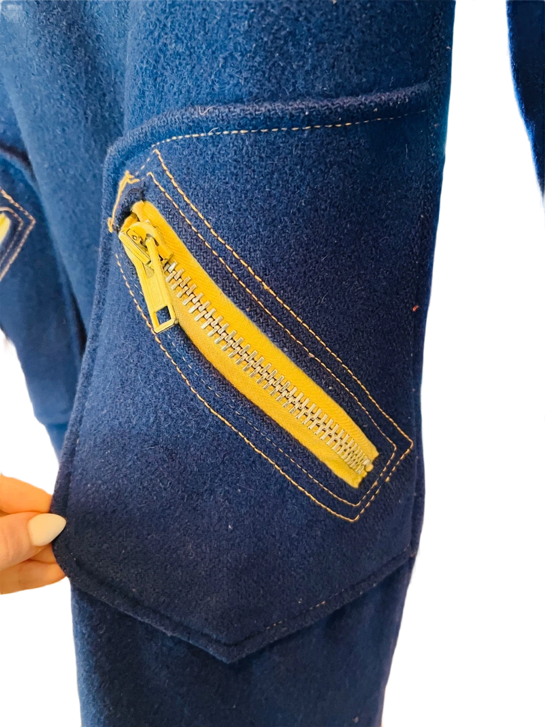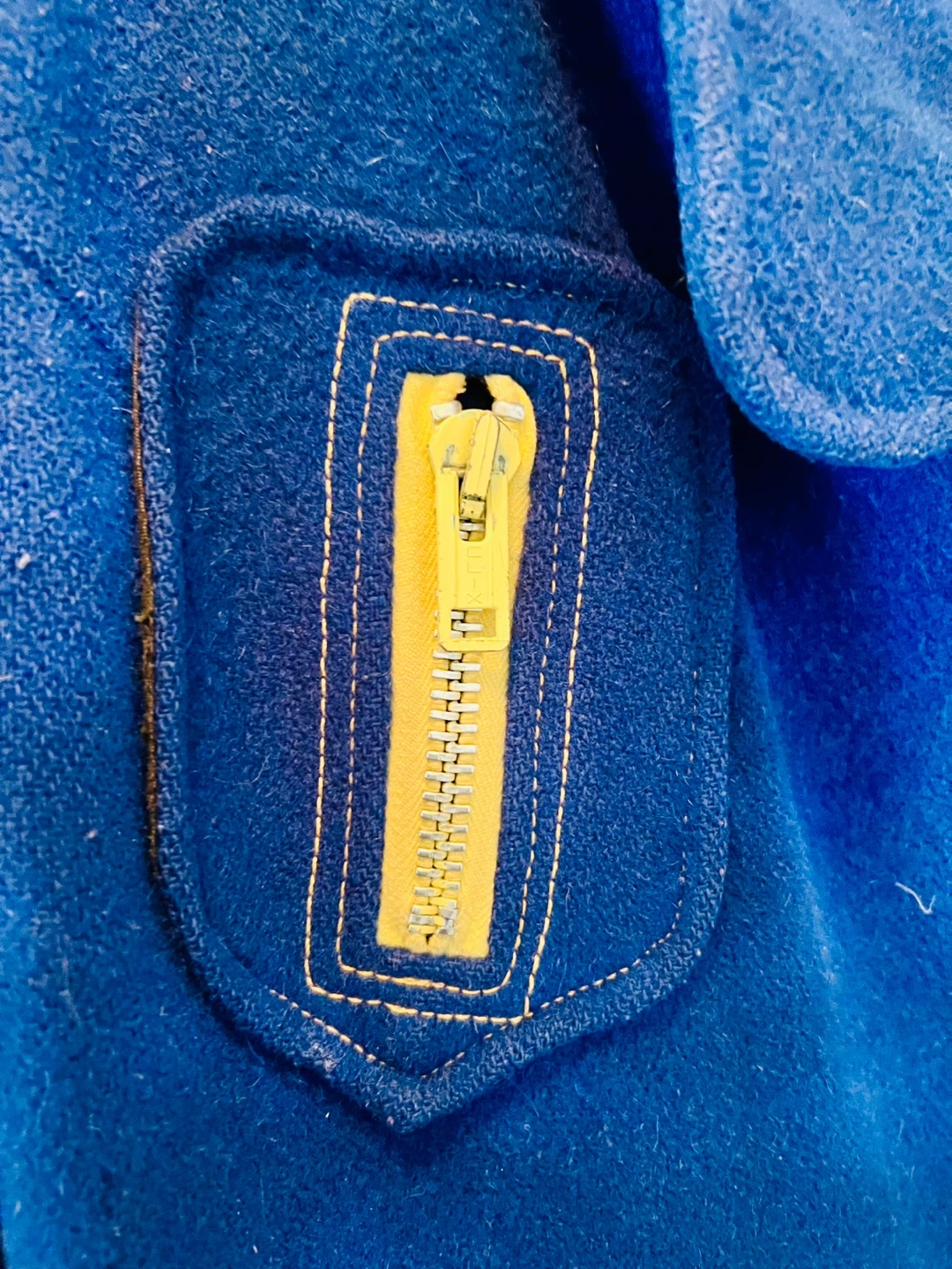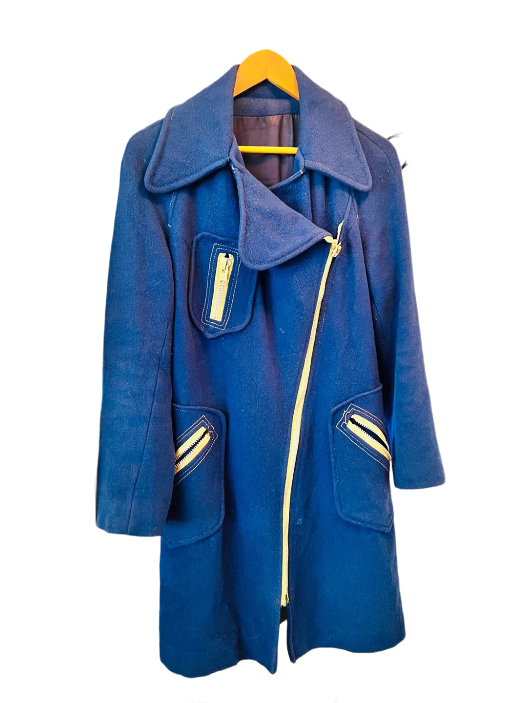 Stylish vintage La Clique French royal blue wool coat. It has a unique design with yellow zippers, three pockets, and an off-center zipper close. Purchased in London from a vintage shop.