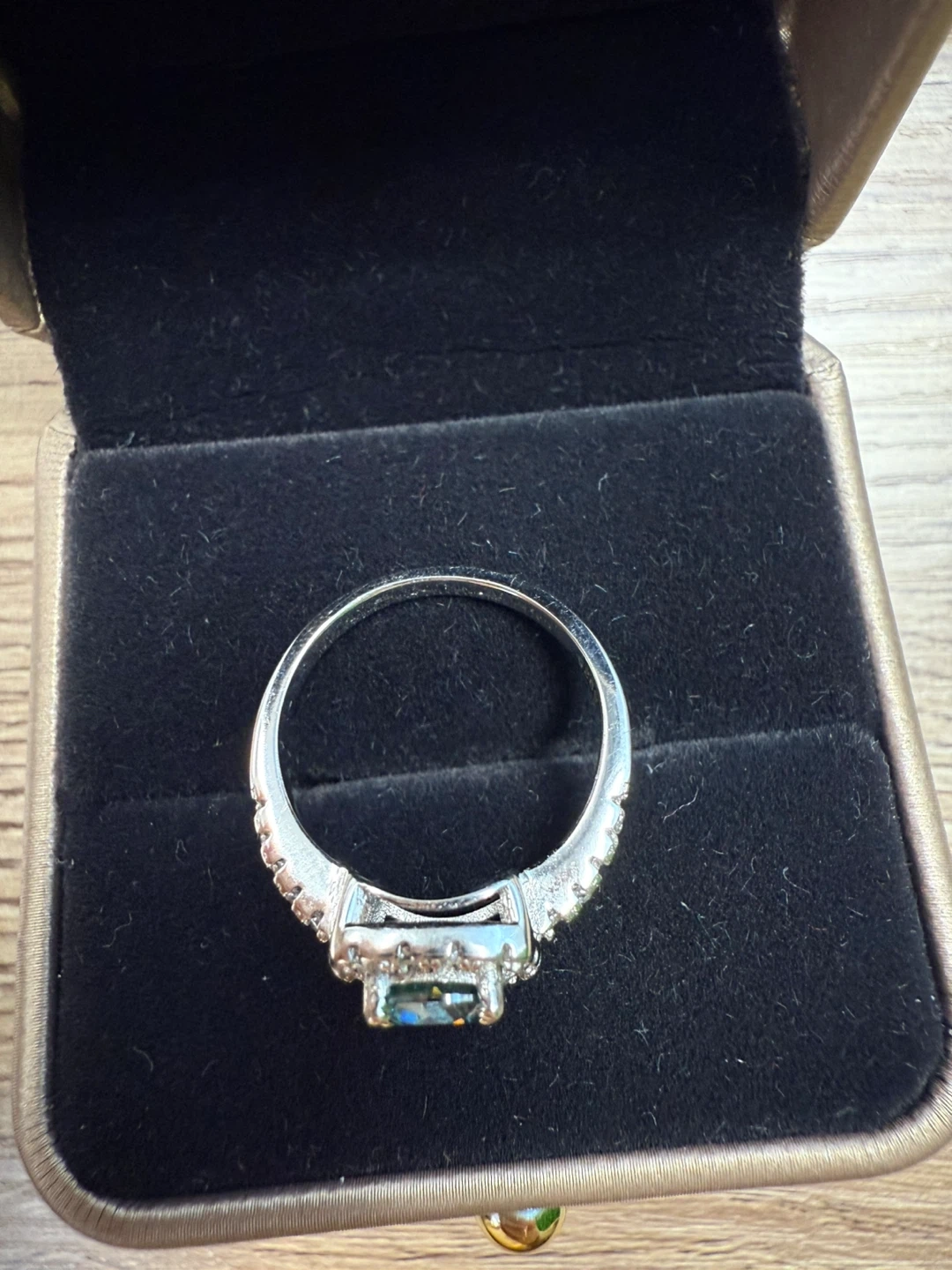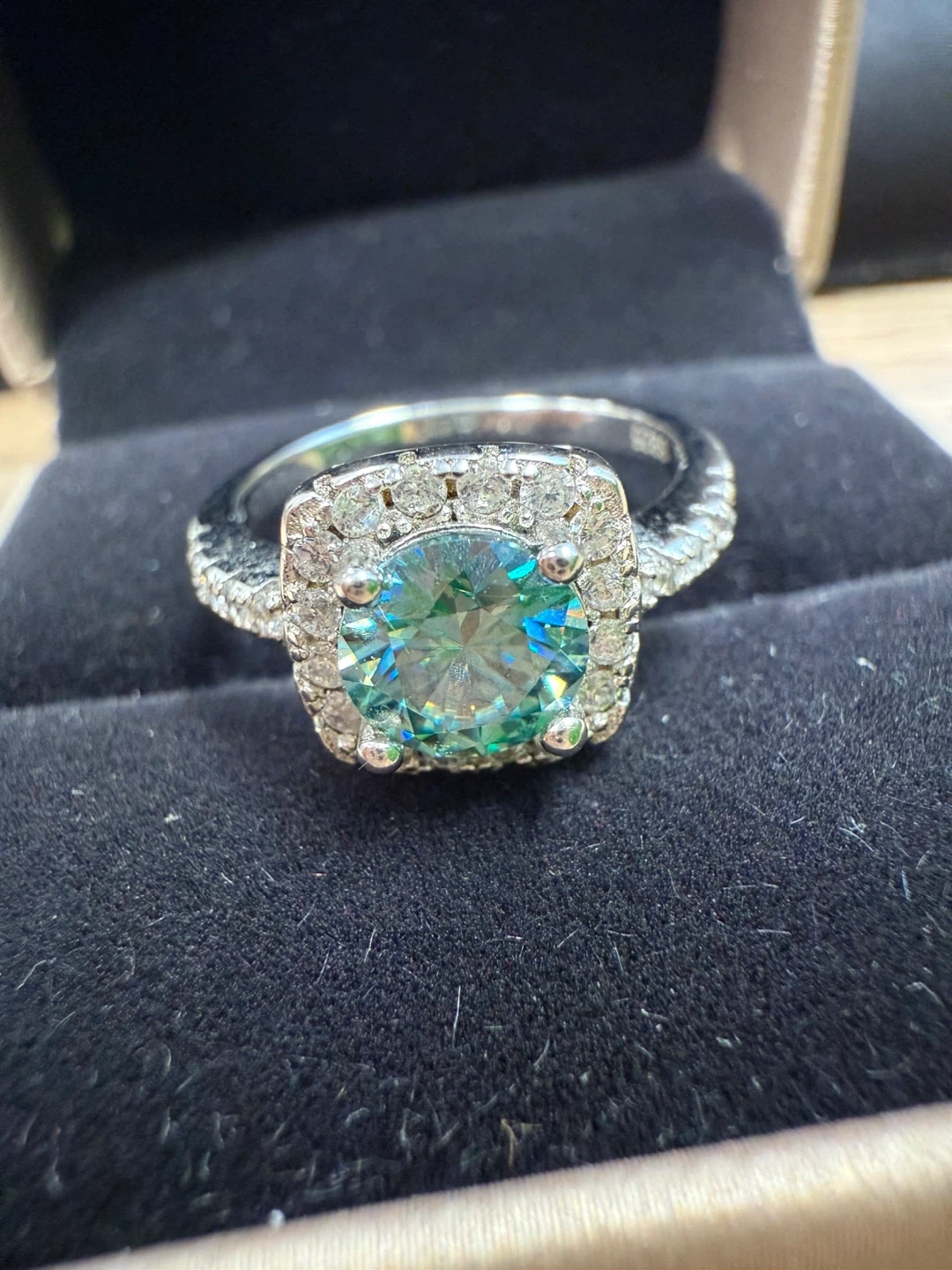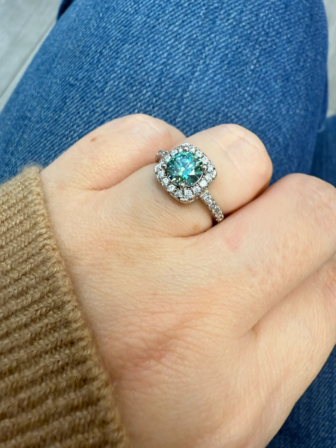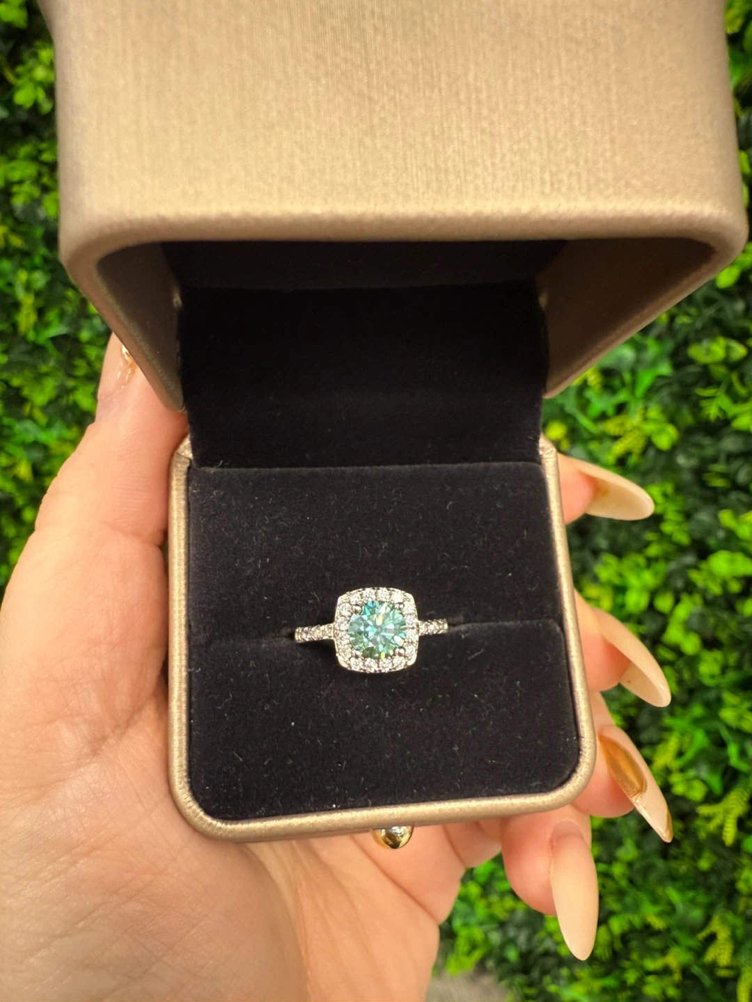 Brand new sterling silver ring features a stunning 1 Carat Turquoise Moissanite centre stone surrounded by a halo of smaller stones. The band is also embellished with pave-set stones. It's a lovely piece for any occasion! Comes with GRA documentation certificate and card.