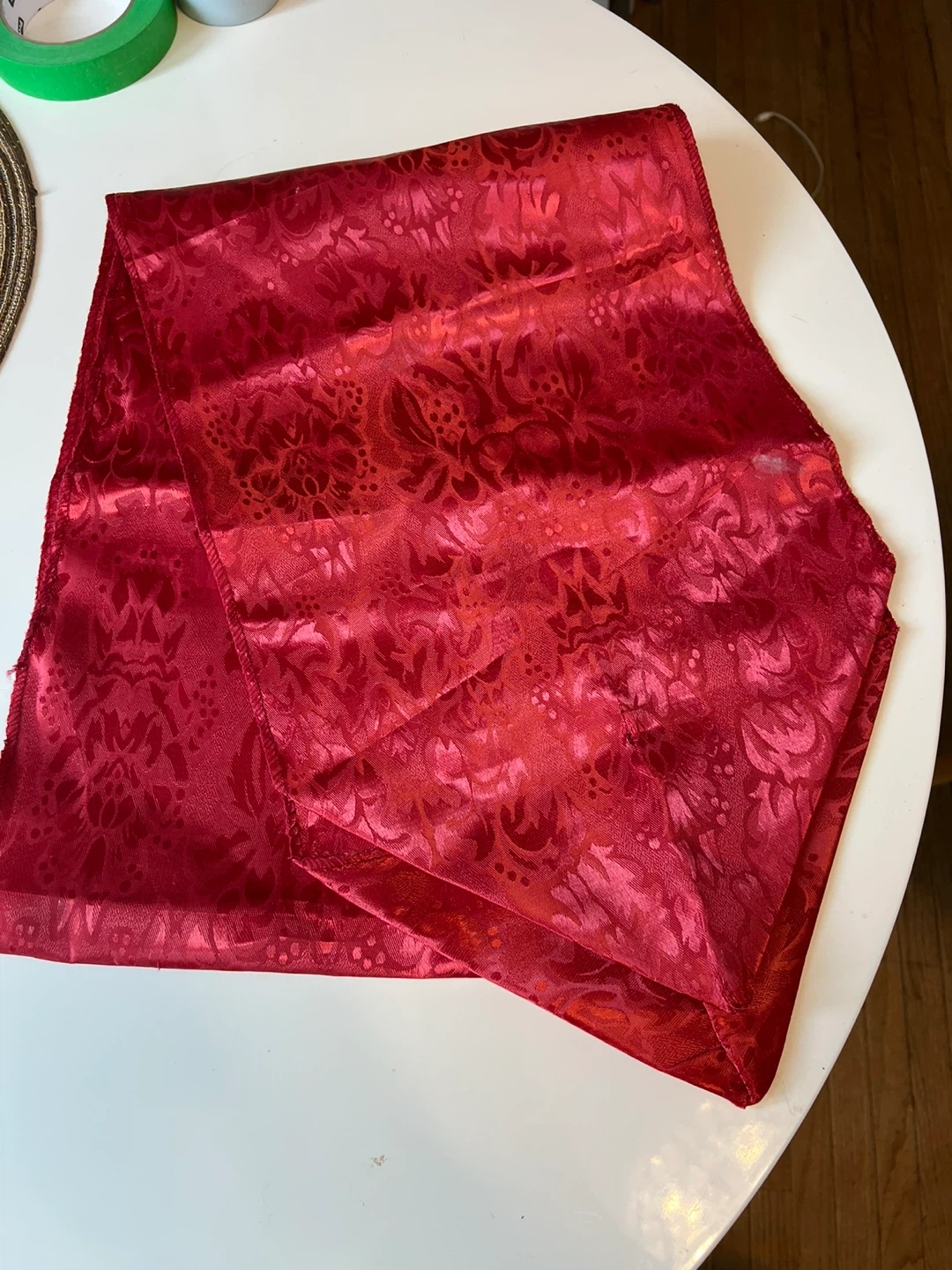 A vibrant red table runner with a beautiful floral jacquard pattern. It's made of a shimmering satin-like material. Perfect for adding a festive touch to your dining table!