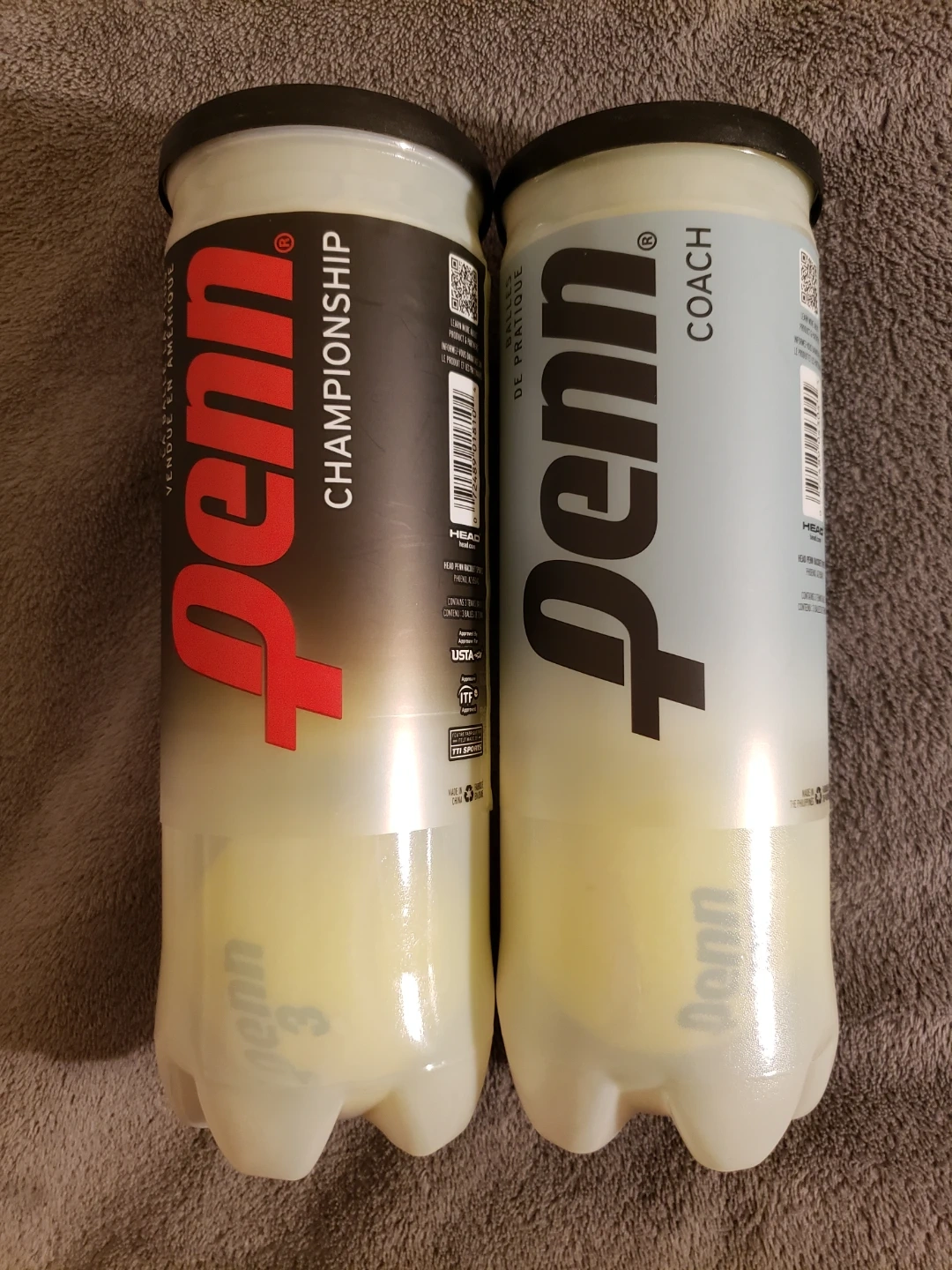 Two cans of Penn tennis balls. One can is Championship and the other is Coach. Ideal for practice and match play!