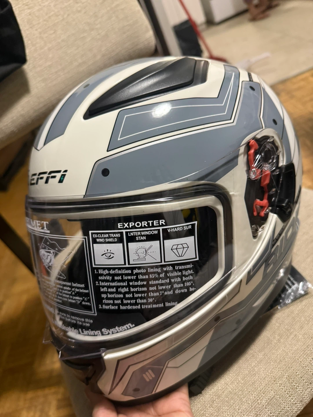 This is an EFFI brand motorcycle helmet. It features a removable and washable lining system. High-definition photo lining with transmission not lower than 85% of visible light.