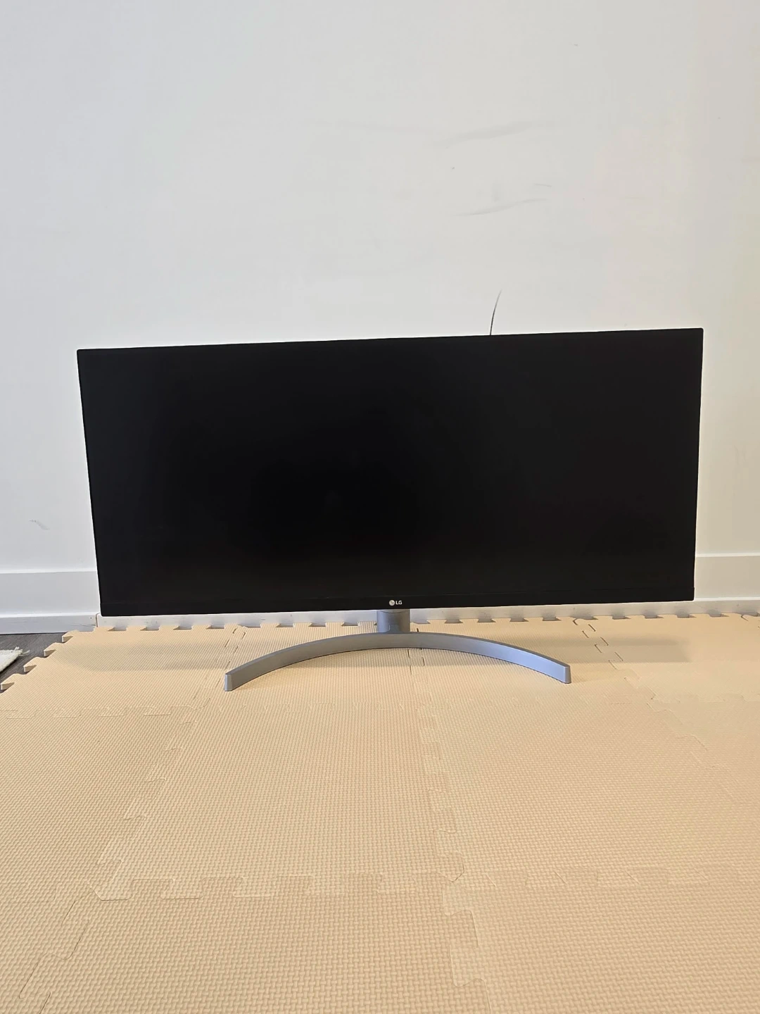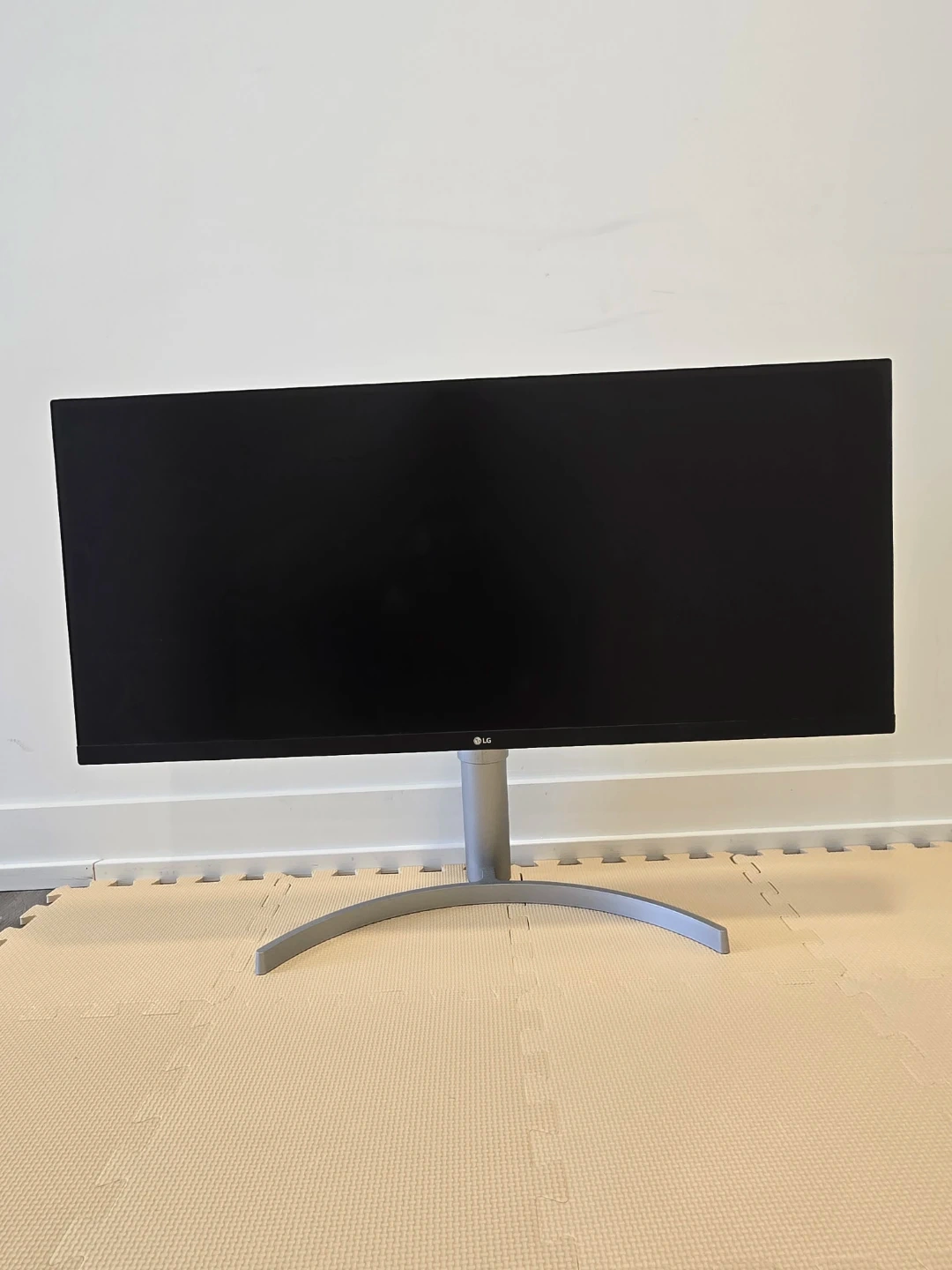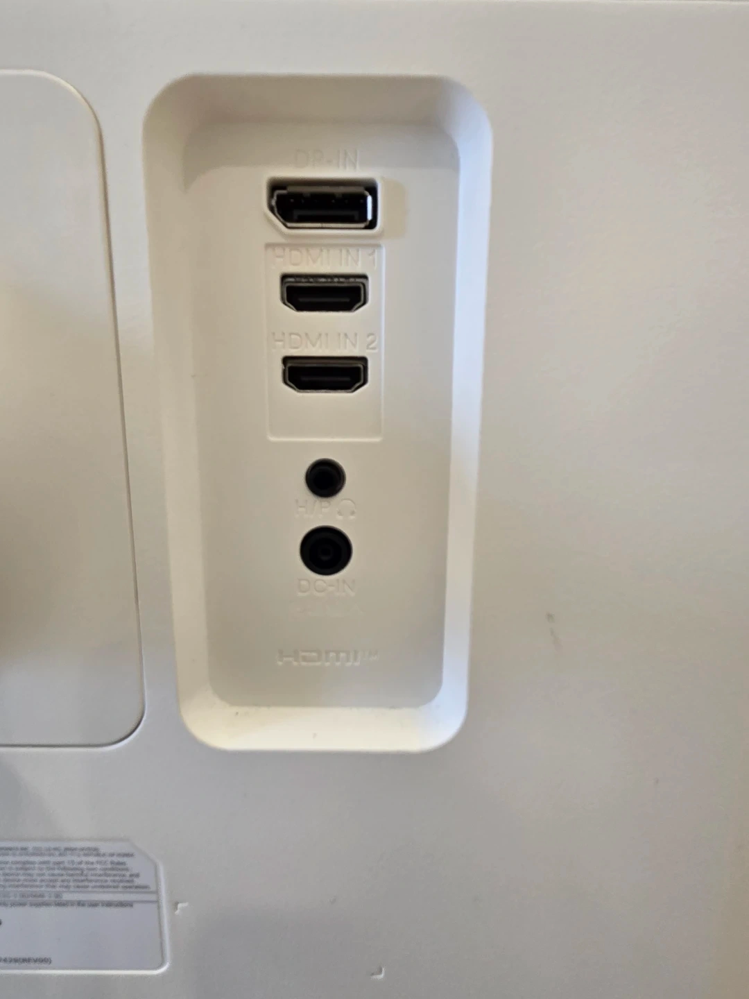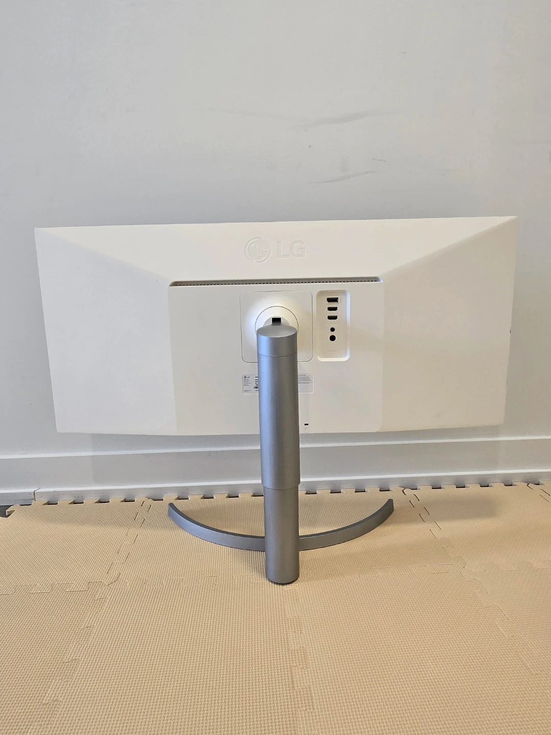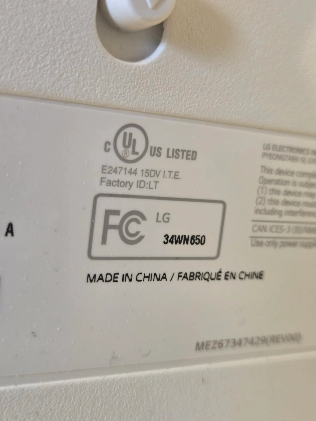 LG 34WN650-W monitor. Manufactured March 2021. It comes with DP-IN, HDMI 1, and HDMI 2 ports.
