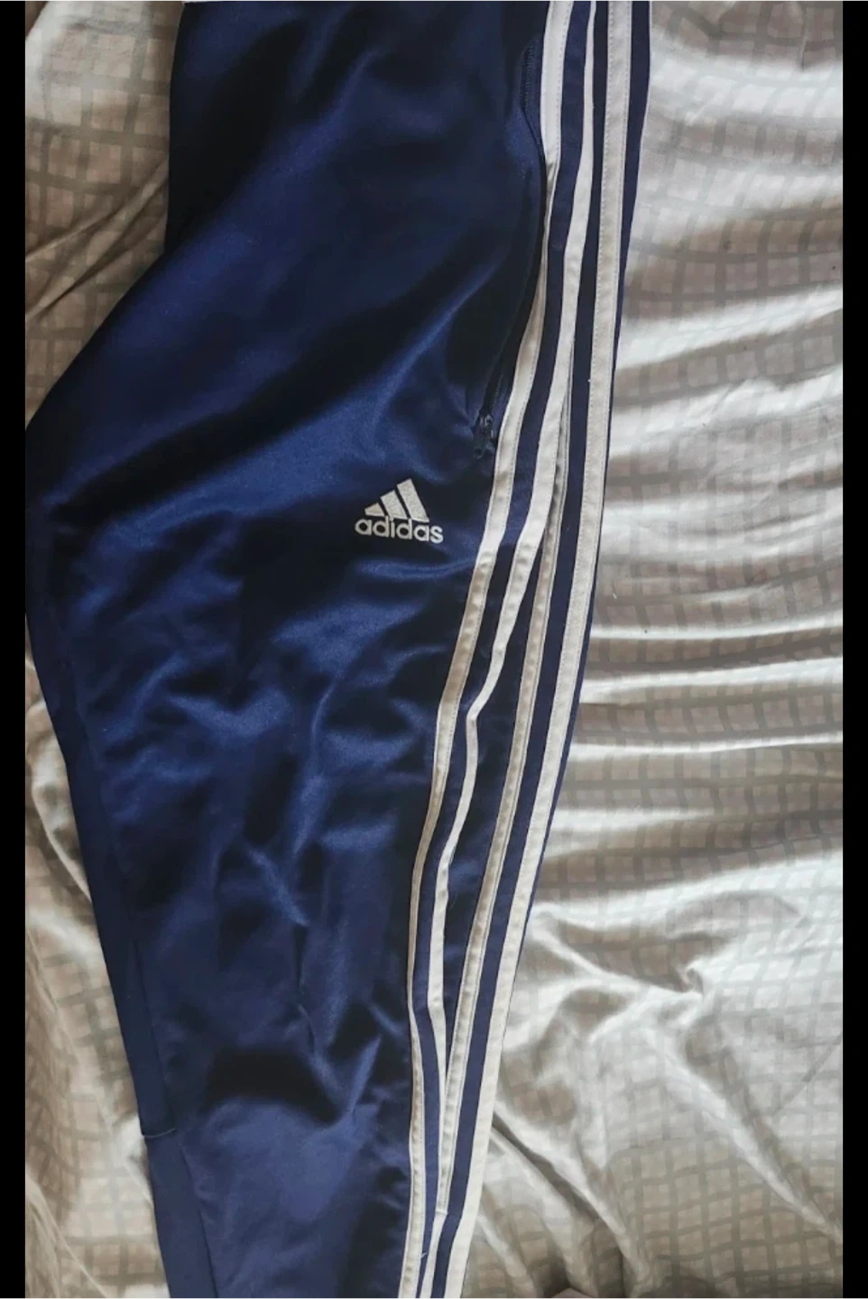 Navy blue Adidas track pants with white stripes. Features a shiny material and a zippered pocket. Great for sports or casual wear!
