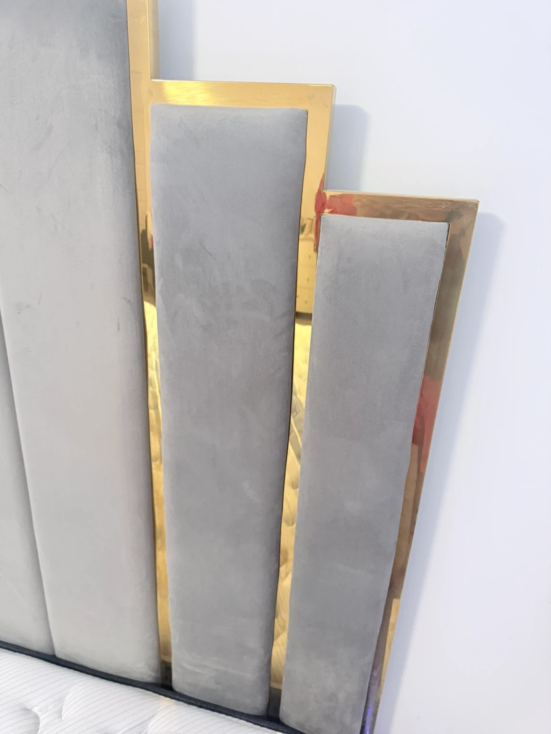 Stylish California King bed frame featuring plush grey velvet upholstery and elegant gold trim. Dimensions are 86.6" L x 73.6" W x 65.4" H. This bed frame supports up to 1000 lbs.It's a gorgeous centrepiece for any bedroom!