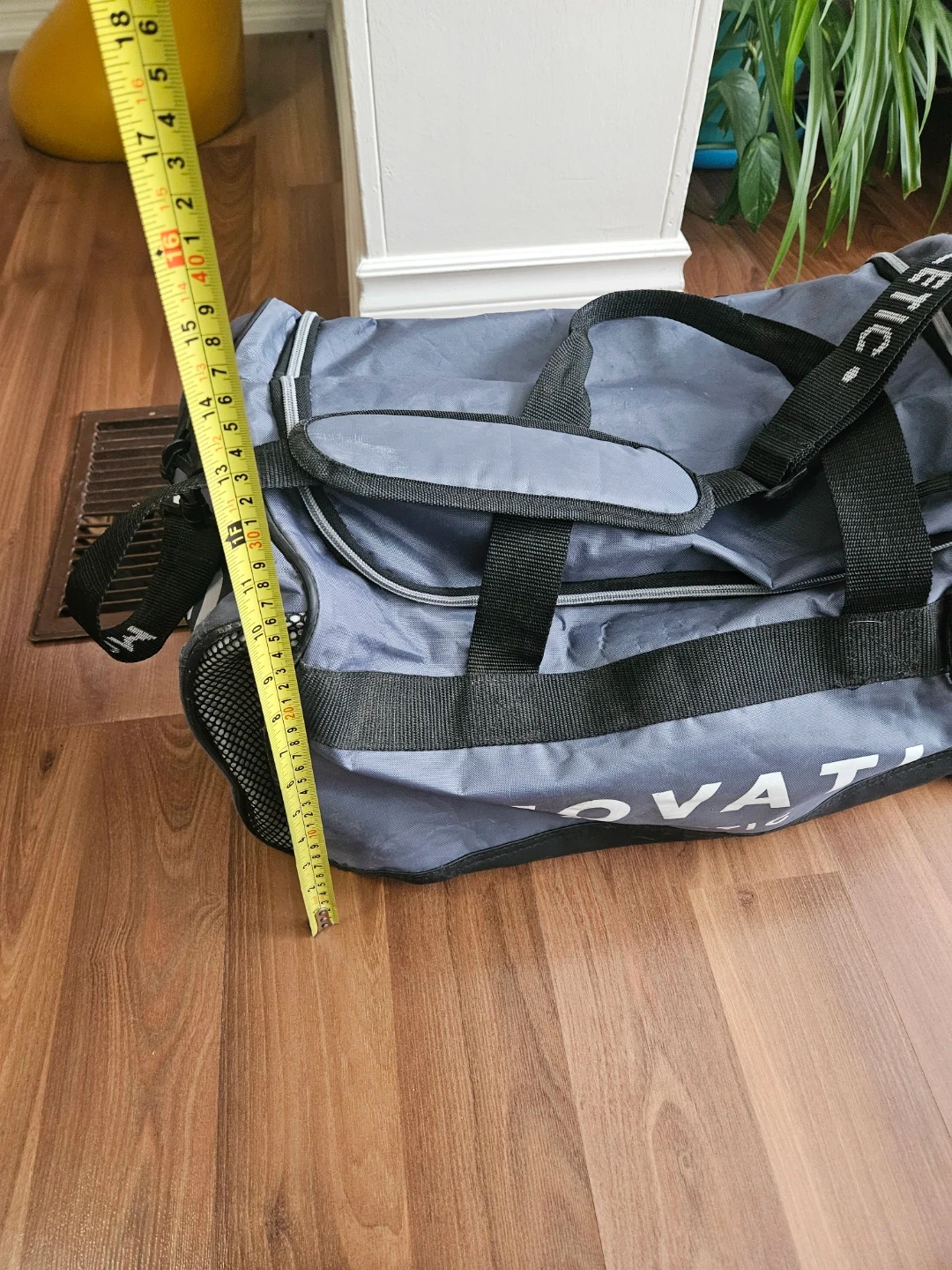 Grey duffel bag with black accents. It measures approximately 18 inches long. Features mesh side pockets and a front zippered compartment.