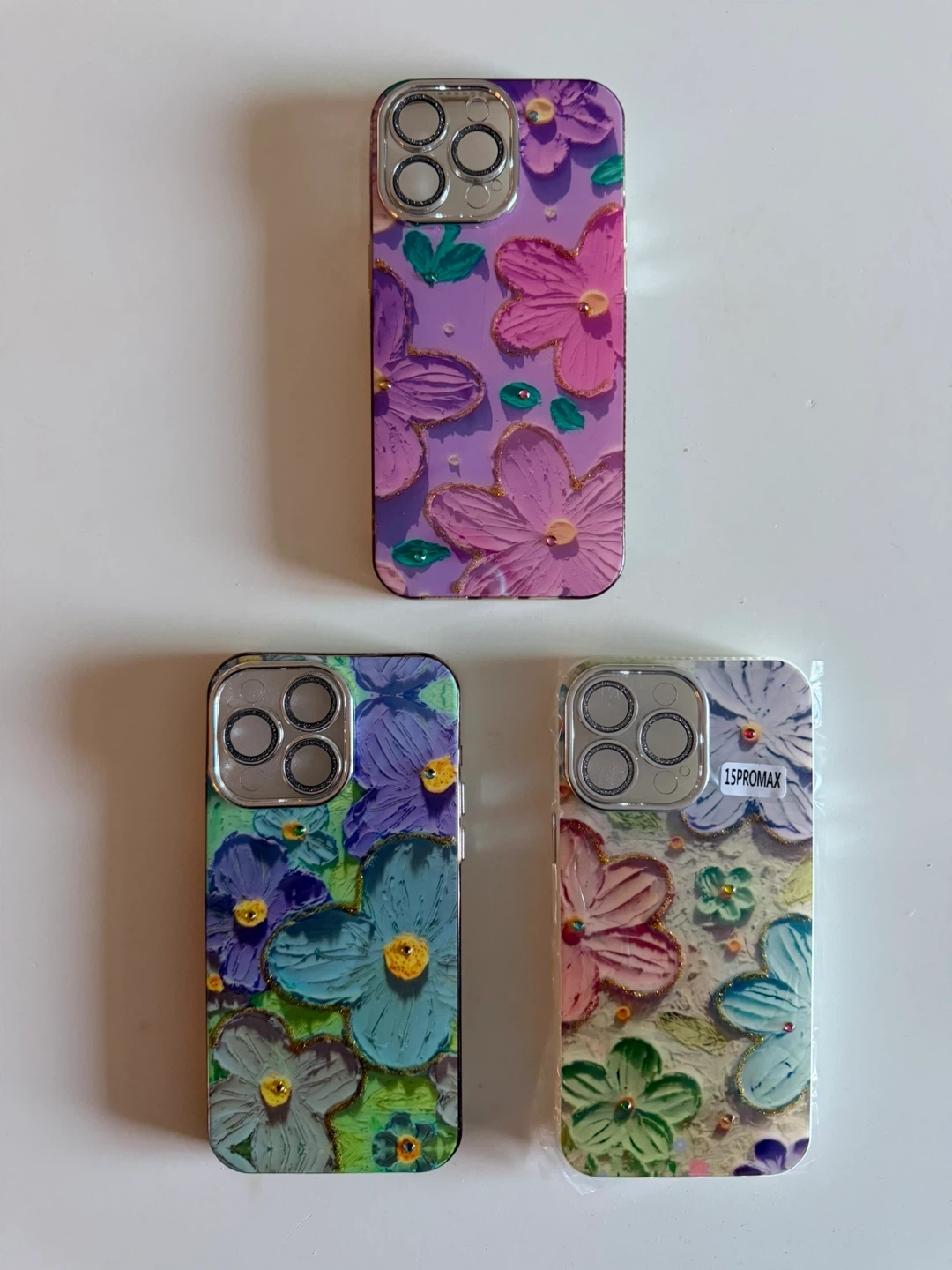 Three decorative phone cases for an iPhone 15 Pro Max. Each case features a unique floral design with textured petals and glitter accents. Offers stylish protection for your phone! Each for $10 or all for $25. Pick up from Liberty village