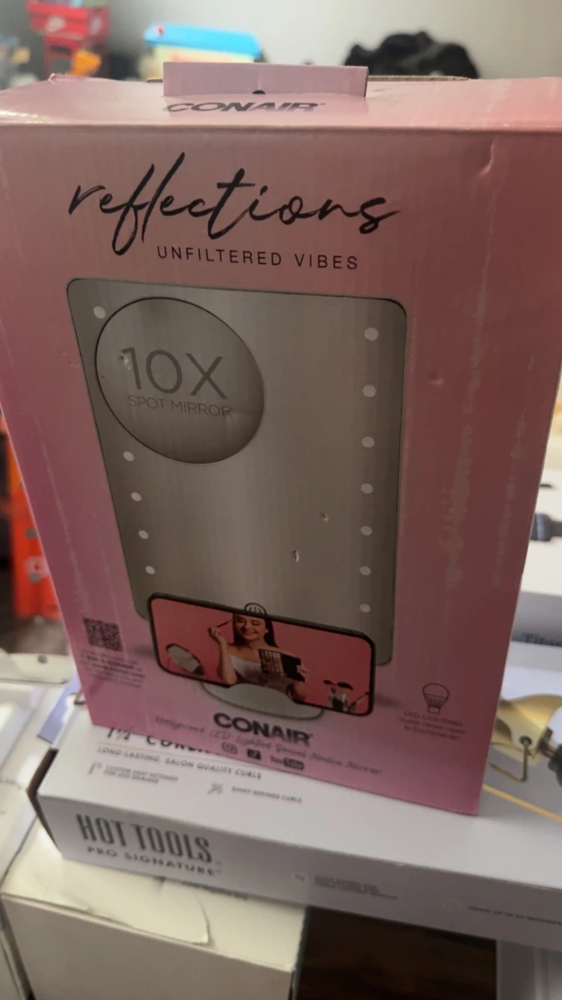 This Conair Reflections mirror features 10x magnification for detailed grooming. It's designed for precise makeup application. The illuminated ring light provides clear visibility.