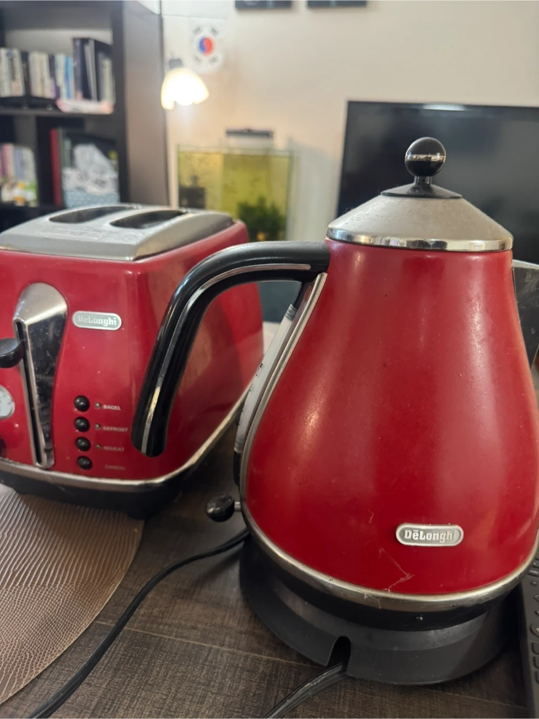 A red DeLonghi electric kettle and toaster set. The kettle has a silver trim and black handle. The toaster has multiple settings including bagel, defrost, reheat, and cancel.