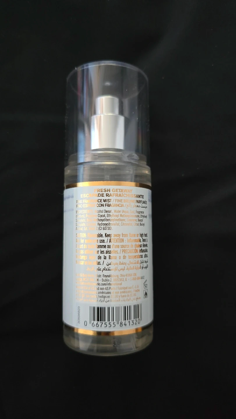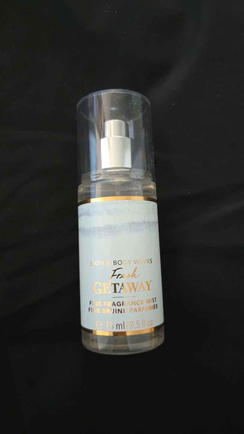 This is the Bath & Body Works Fresh Getaway Fine Fragrance Mist. It's a 75 mL bottle. The mist is designed to be sprayed on for a refreshing scent.