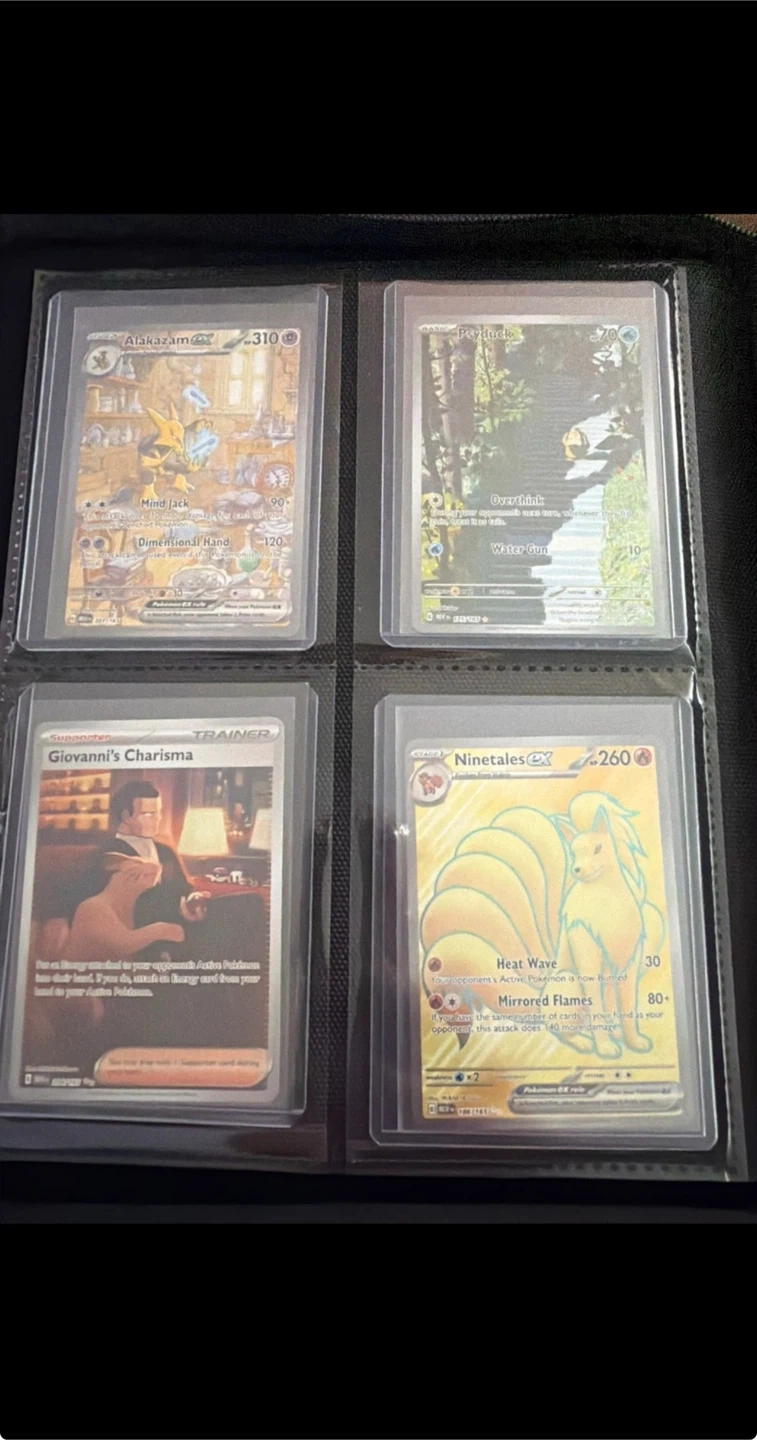 Four Pokemon trading cards are shown. The cards feature Alakazam EX, Psyduck, Giovanni's Charisma, and Ninetales EX. These cards are in protective sleeves within a binder. They're great for collectors and players!