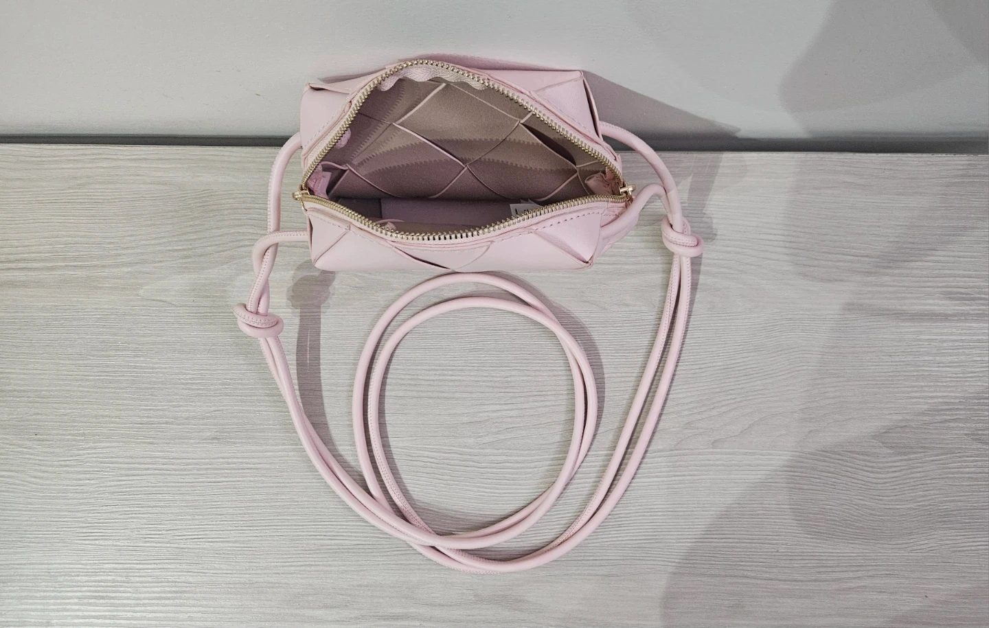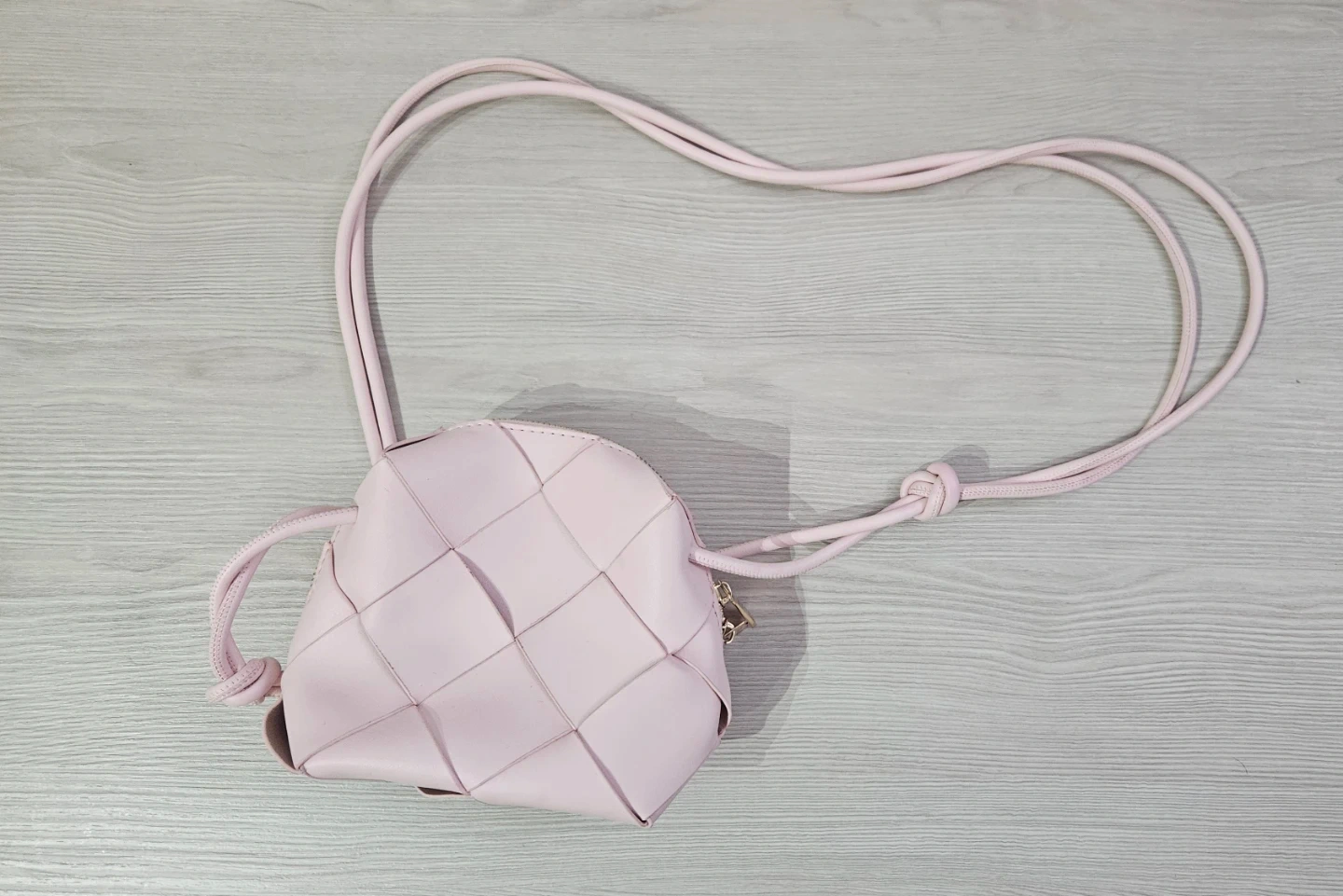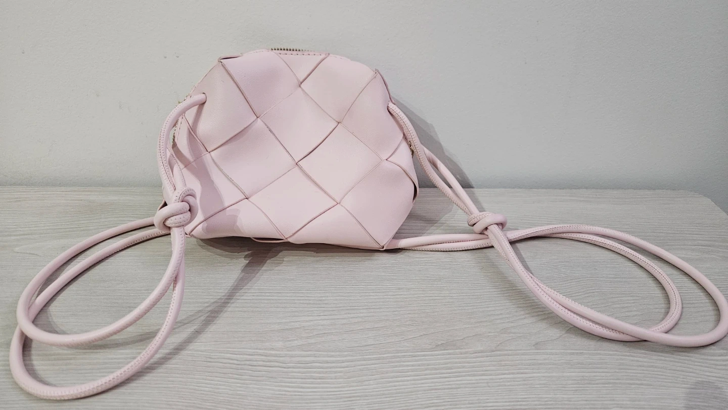 This pink crossbody bag features a woven design and a long strap with knots. It's made of a smooth material and has a zippered closure. The interior is lined and has a small pocket.