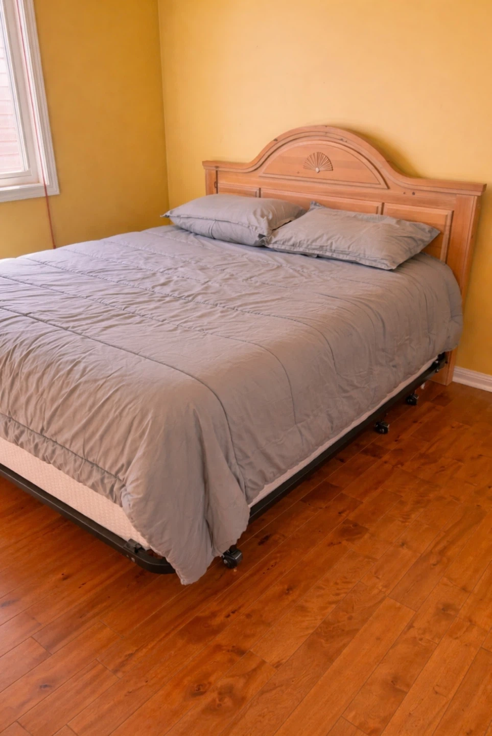 Queen bed frame with an elegant light wood headboard and a metal support system. Includes a standard queen size box spring. Solid, well-maintained condition!