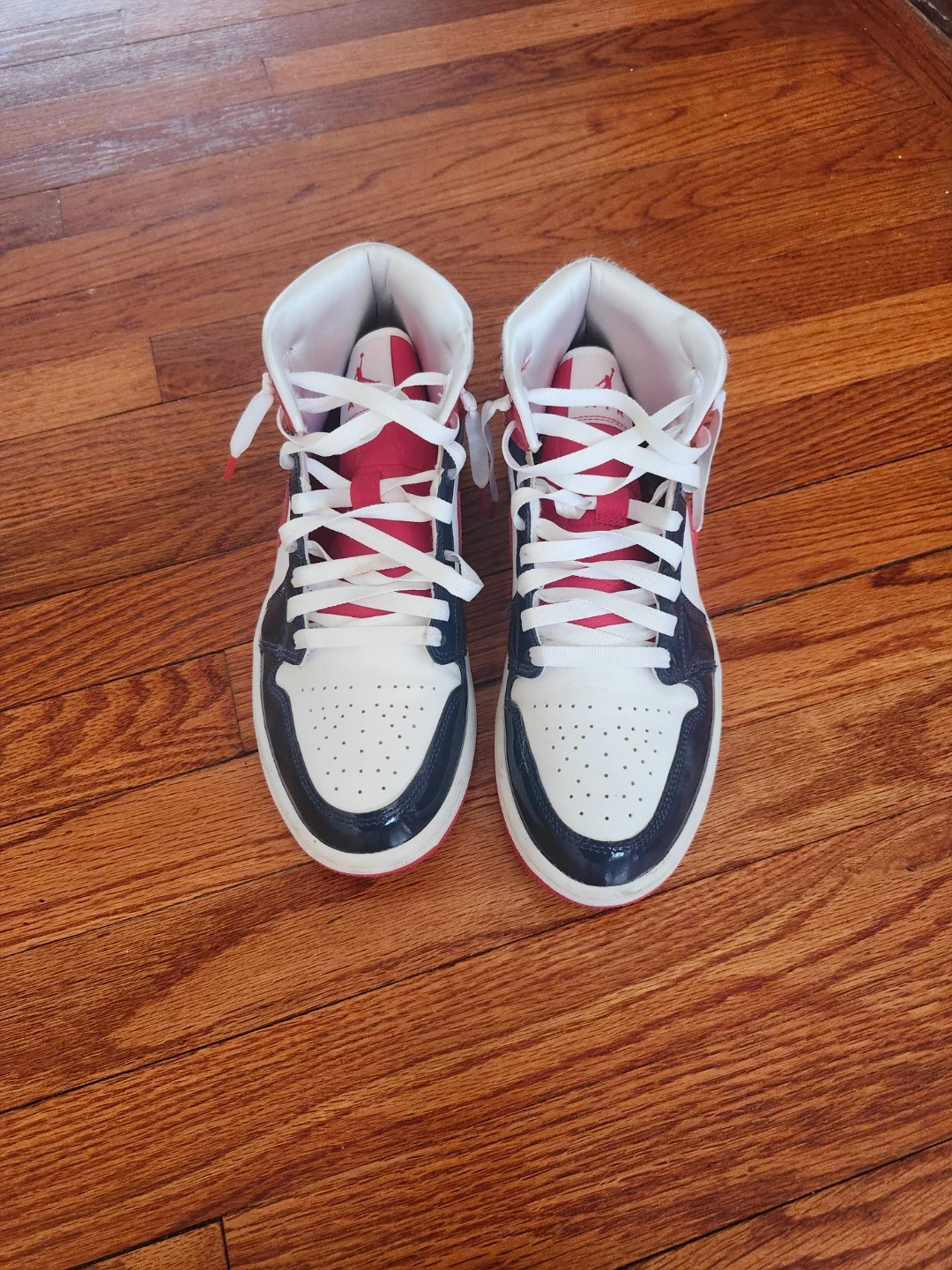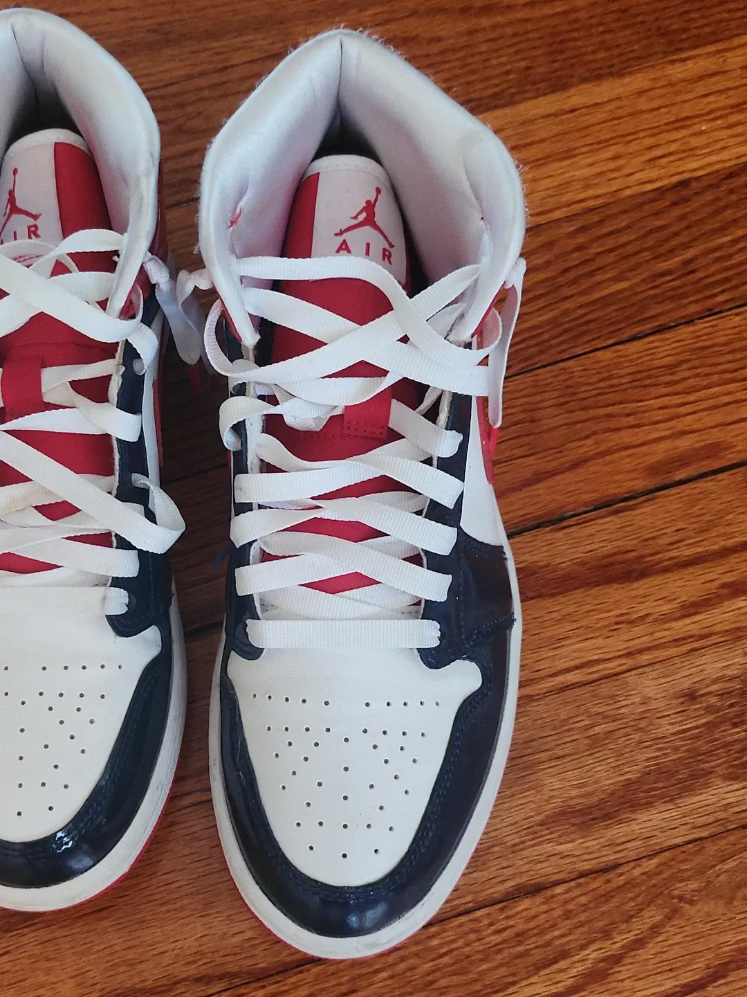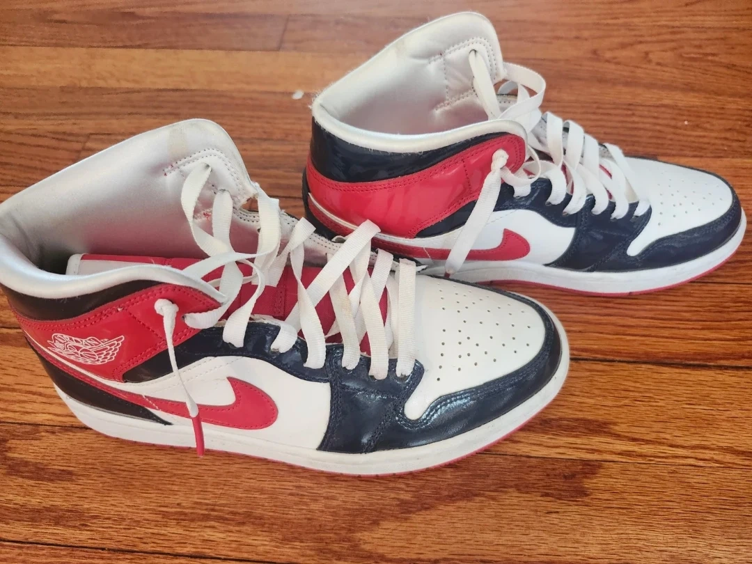 These Air Jordan 1 High OG sneakers come in a classic white, red, and navy colourway. They feature the iconic Jumpman logo and "AIR" branding on the tongue. Leather and synthetic materials. Size 8.5