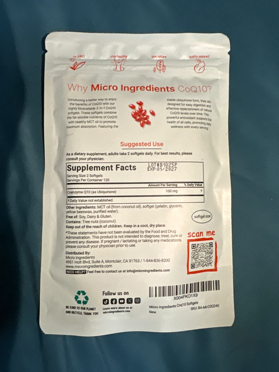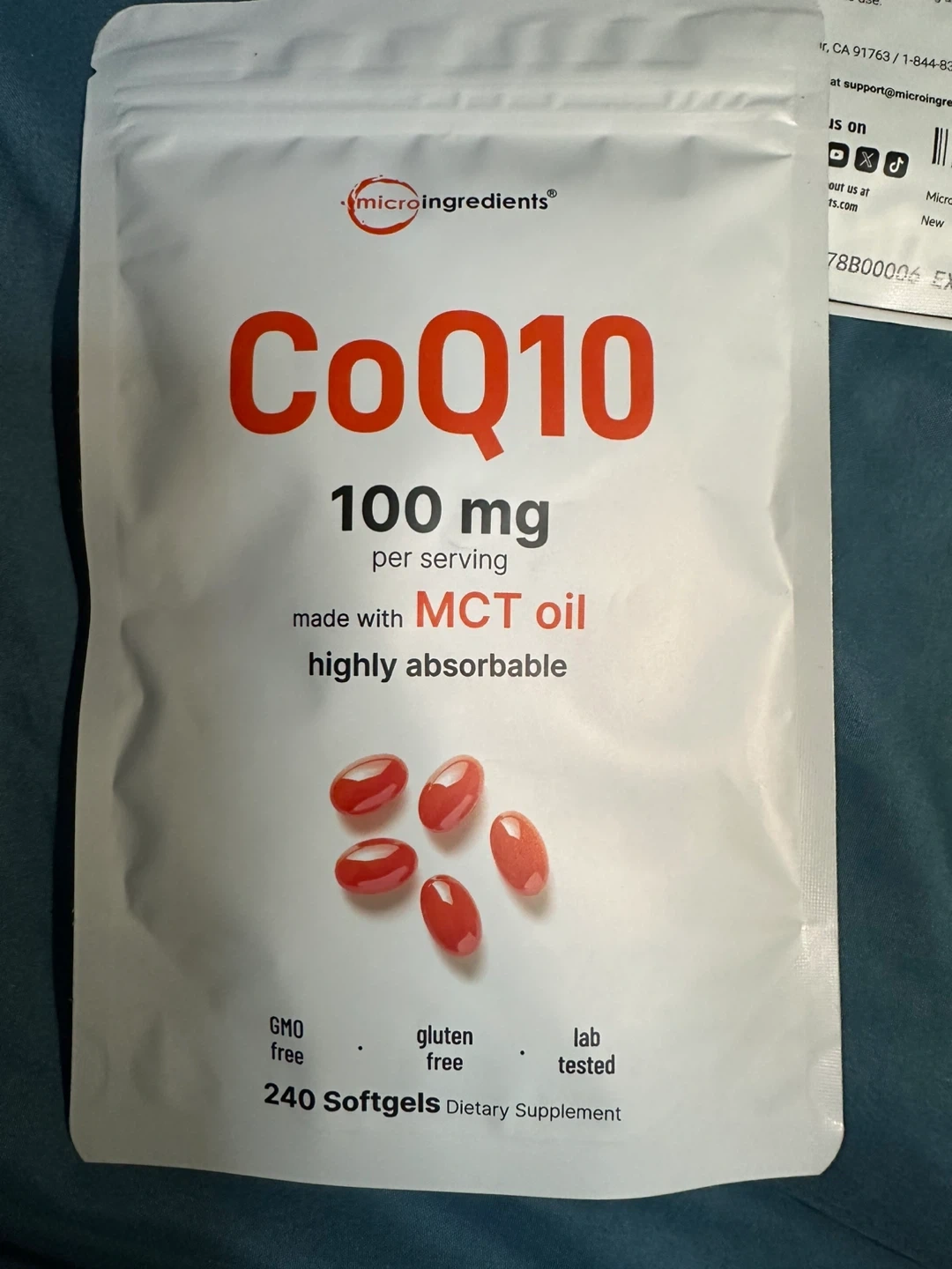 Micro Ingredients CoQ10 100mg softgels, made with MCT oil for enhanced absorption. This dietary supplement comes in a package of 240 softgels. It's GMO and gluten free, and lab tested. Recommended for adults who want to support their body's natural CoQ10 levels.
