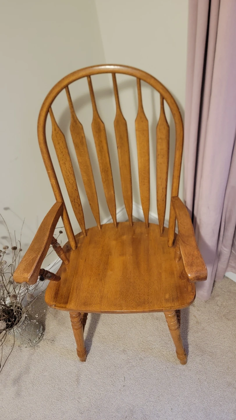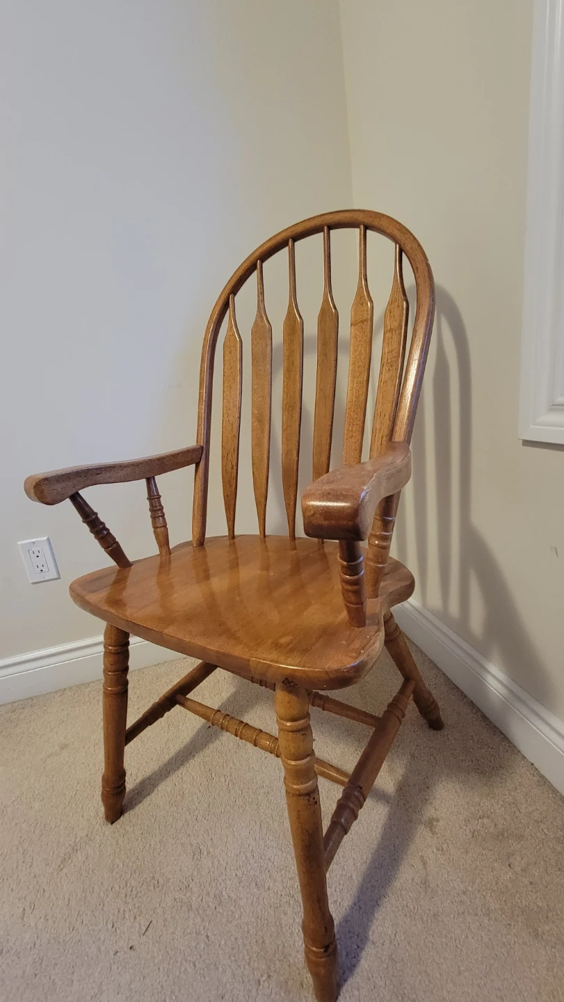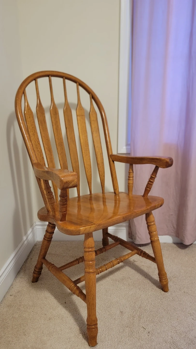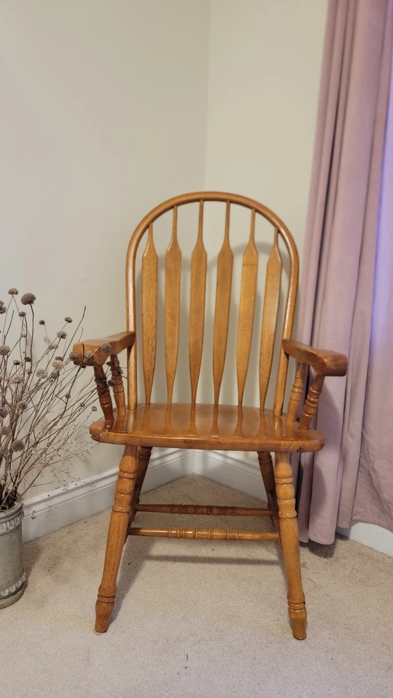 This is a wooden arm chair with a Windsor style design. It features turned legs and a curved spindle back.