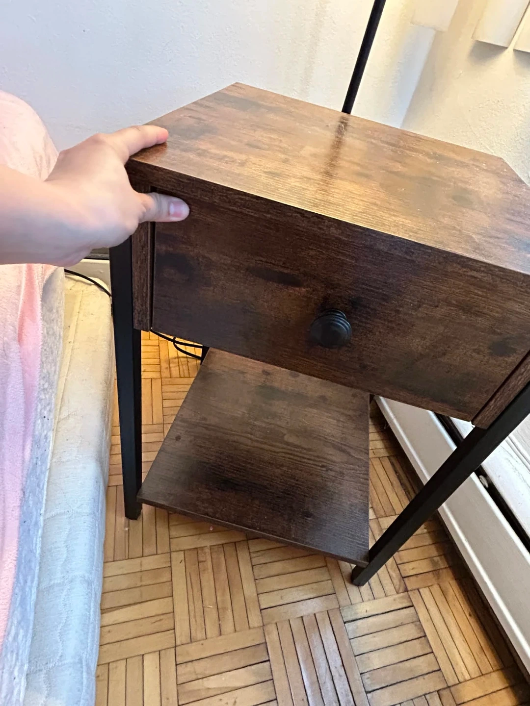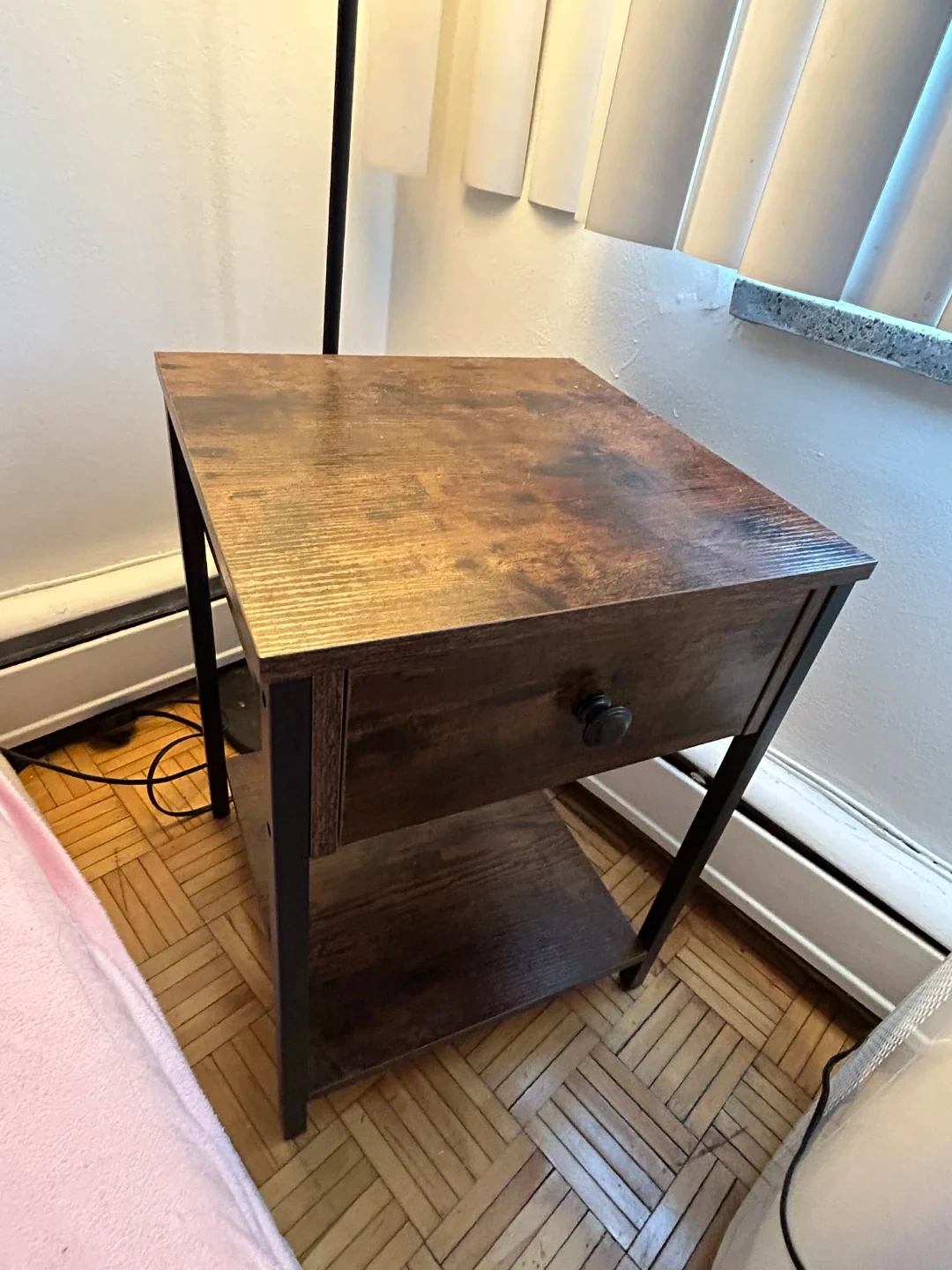 This nightstand has a dark wood finish with black metal legs. It's got one drawer and an open shelf below for extra storage. Measures approx. 15"W x 13"D x 24"H.