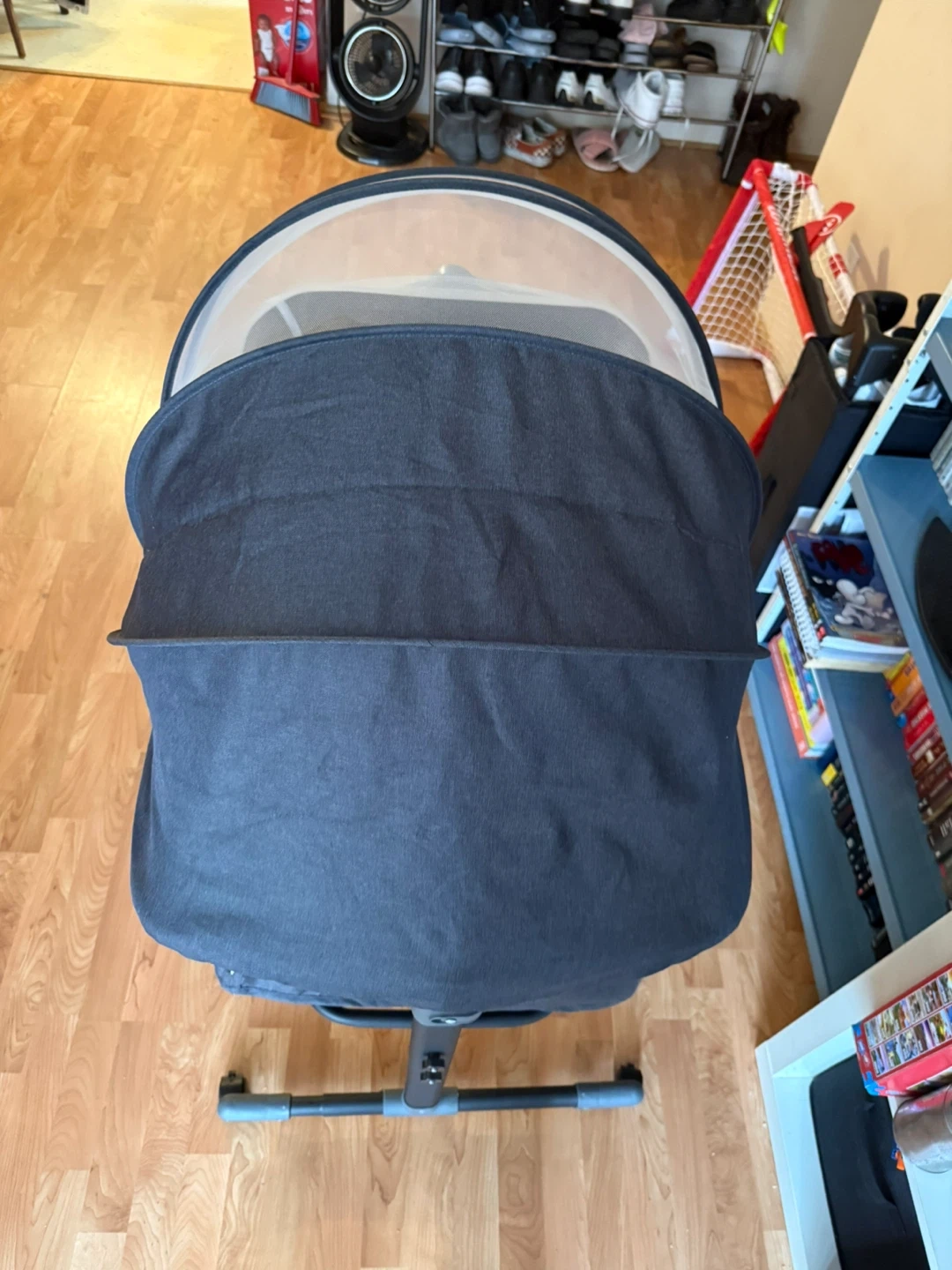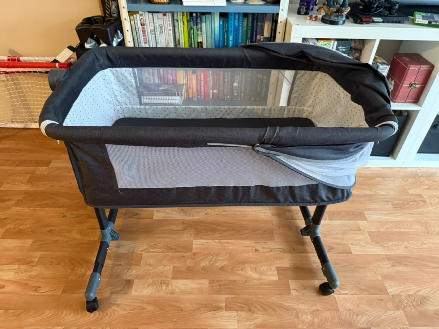 This is an infant bassinet with a mesh side for airflow. It's made of dark grey fabric with a patterned interior lining. The bassinet is on a foldable stand with wheels, making it easy to move around.