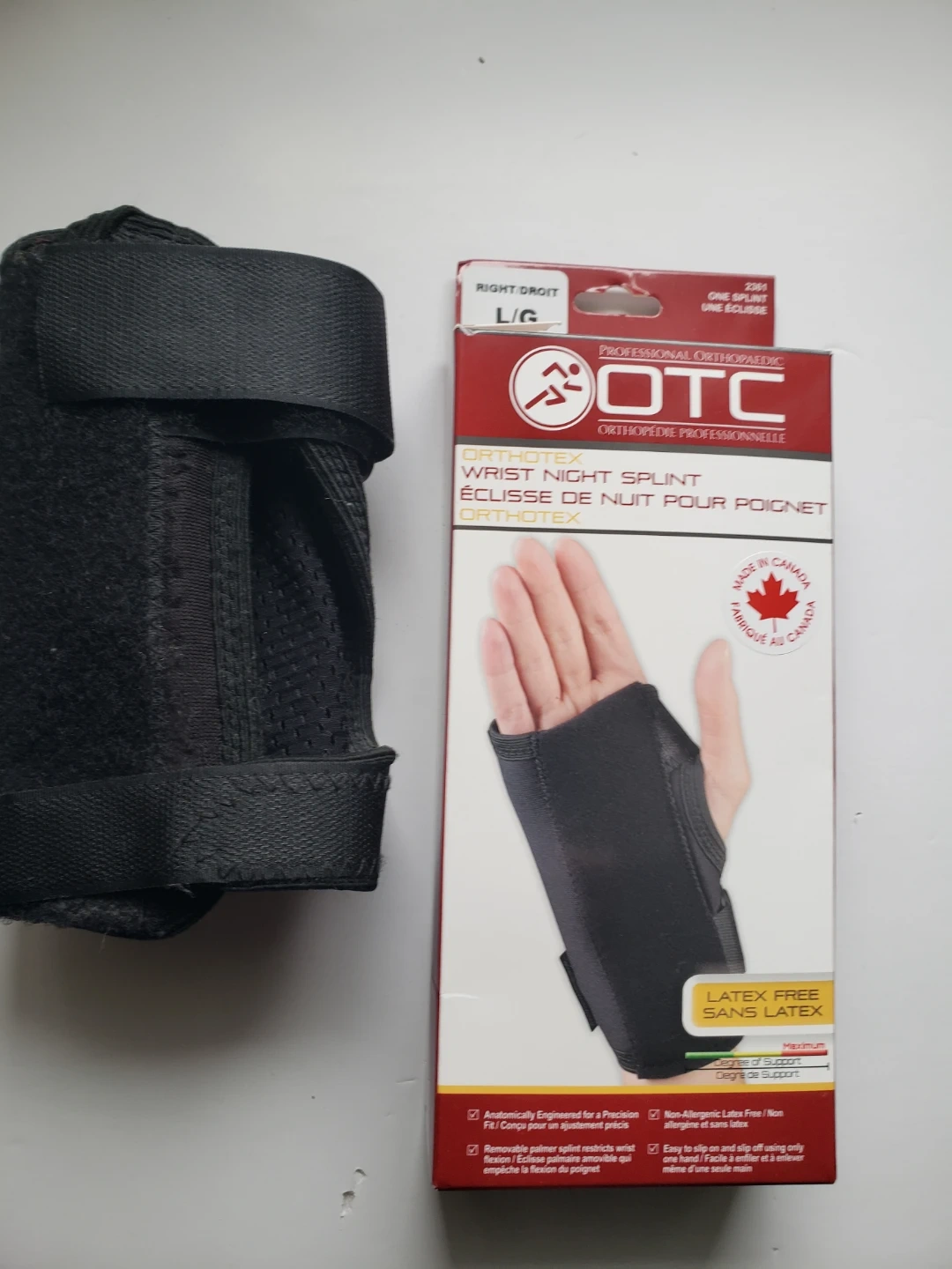 This is an OTC Wrist Night Splint, size L/G, for the right hand. It's made with a perforated glove for breathability and hook-and-loop fasteners. Latex free.