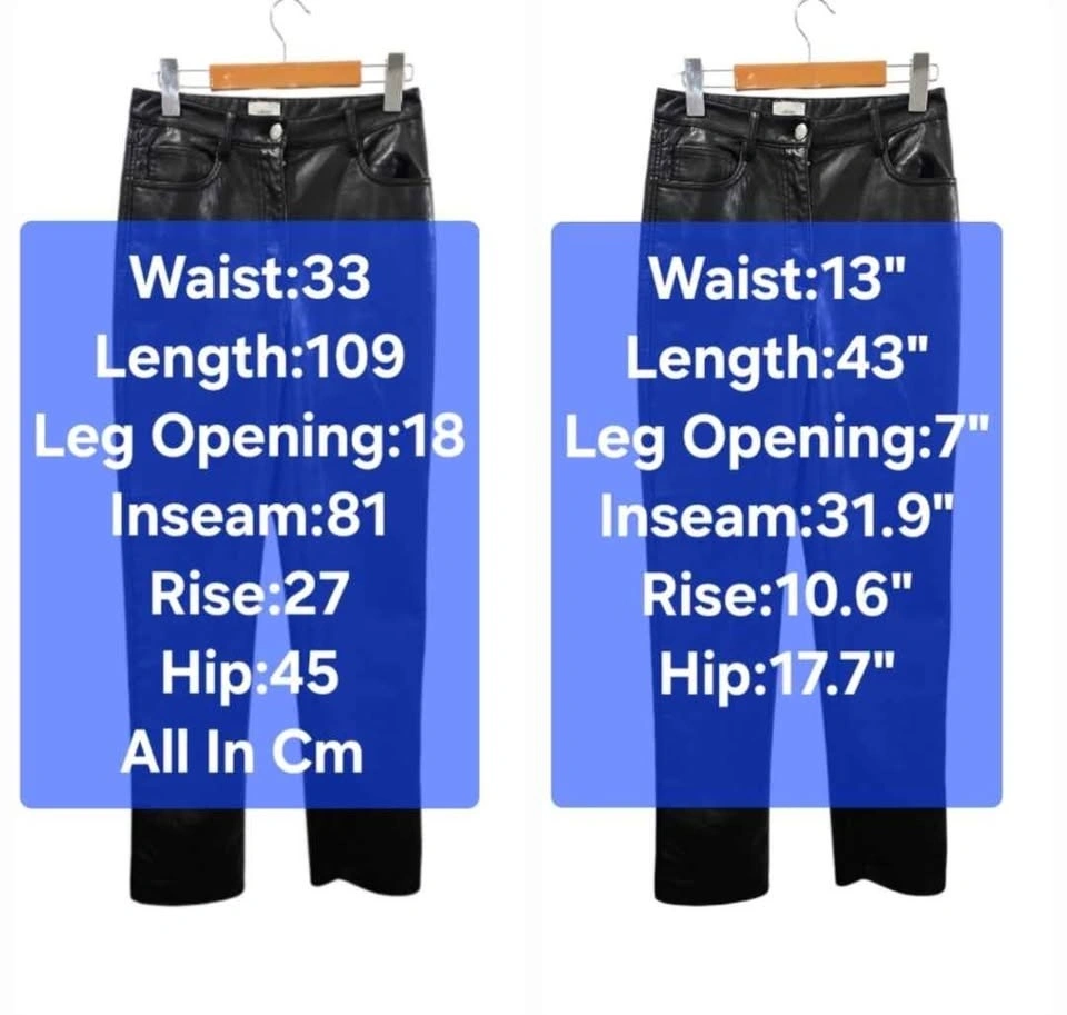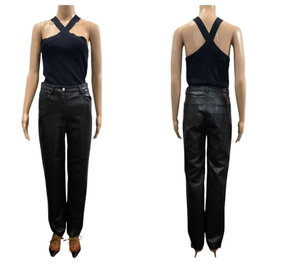 They’re made with innovative vegan leather that looks and feels like the real thing. They have an authentic drape and a soft sheen. Zip fly with tack button closure. Topstitch detailing throughout. Rise: High. Leg: Straight. Length: Full — Intended to hit at the ground while wearing flat shoes.