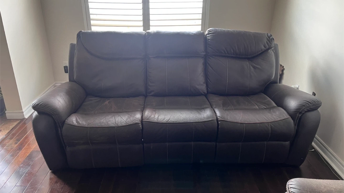 This is a set of brown leather reclining furniture. Includes a three-seater sofa, a loveseat, and an armchair. Made with a durable leather material. These pieces would fit well in a family room or den.