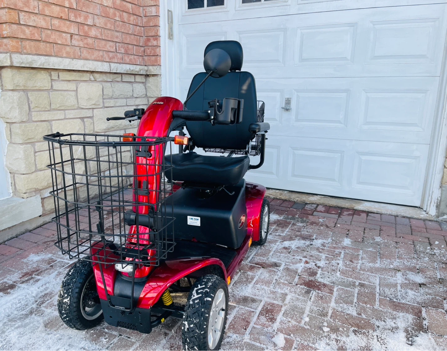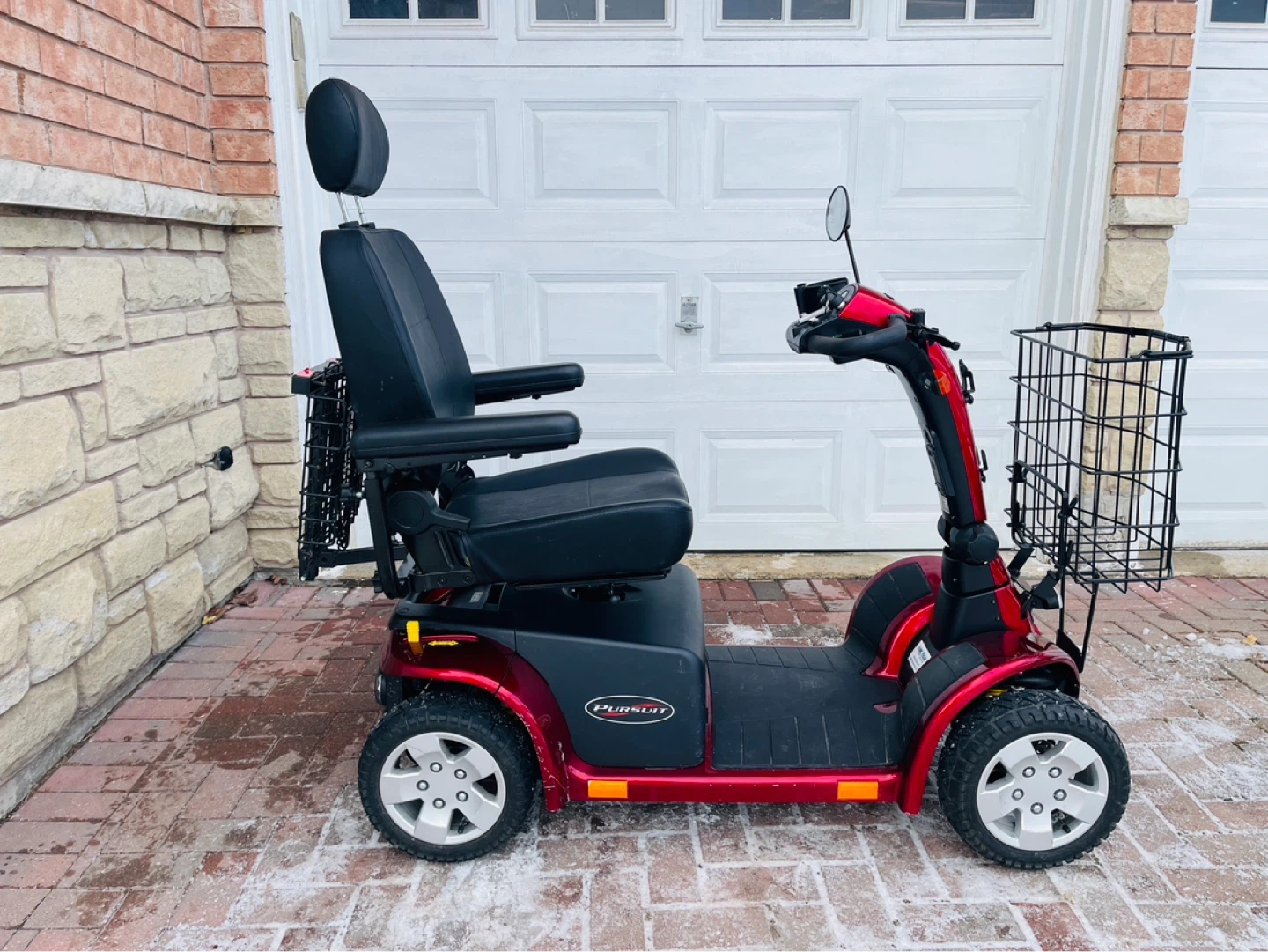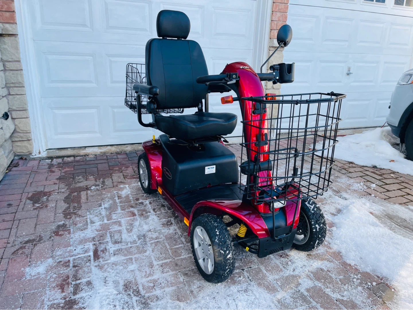 This red mobility scooter has two large front baskets and a rear basket for storage. It offers comfortable seating with adjustable armrests and a headrest. It's well-suited for navigating various terrains.
