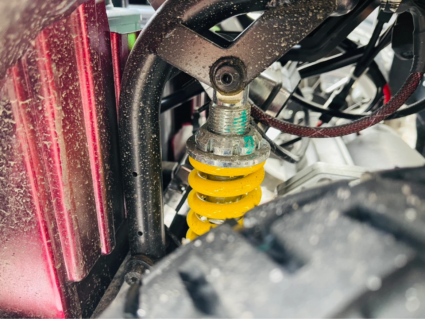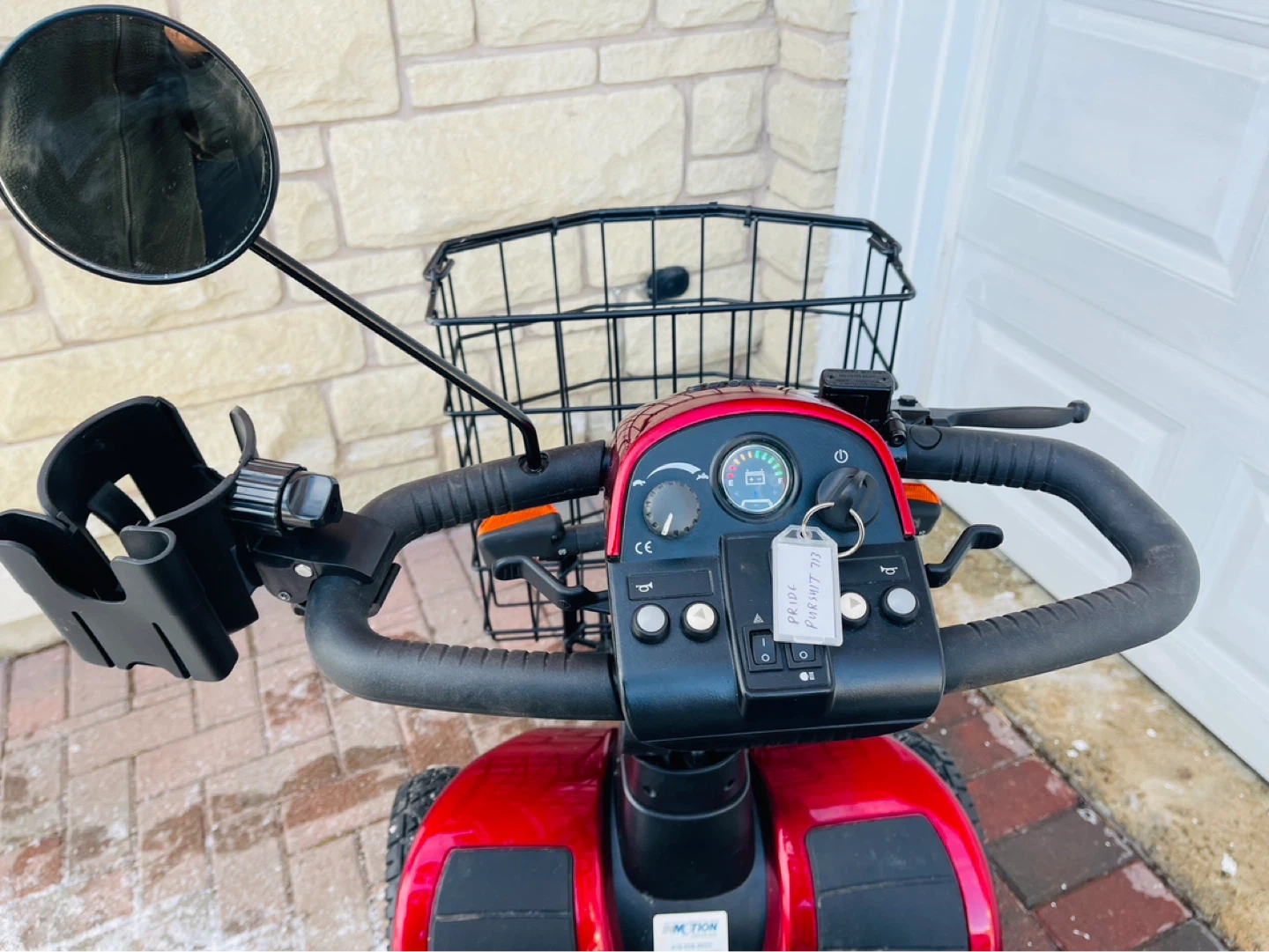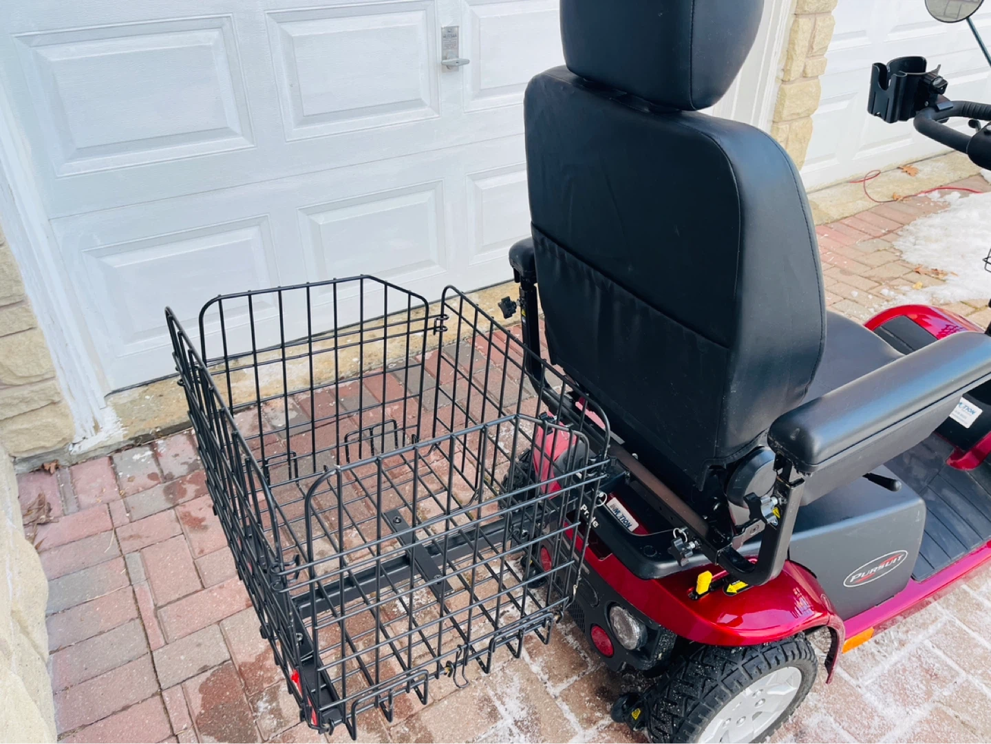 This red mobility scooter has two large front baskets and a rear basket for storage. It offers comfortable seating with adjustable armrests and a headrest. It's well-suited for navigating various terrains.