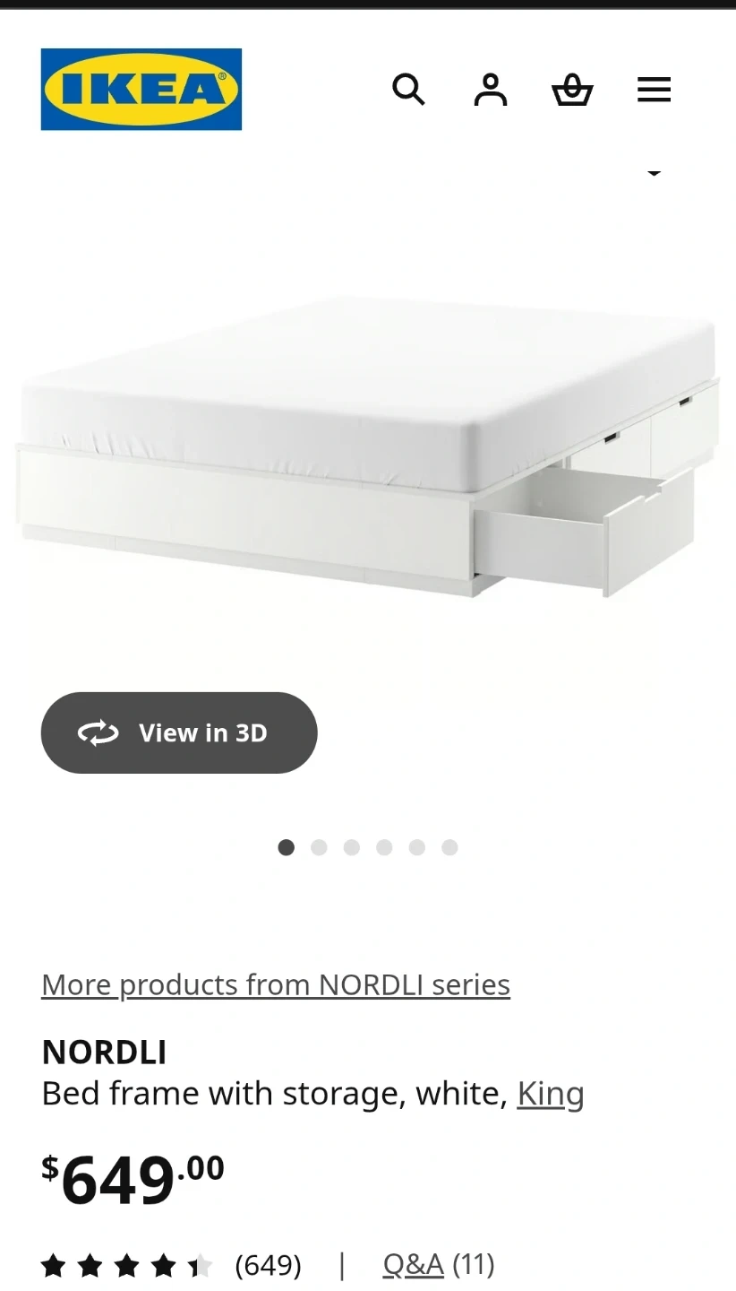 This is an IKEA NORDLI king bed frame with a mattress. It comes in white and features built-in storage drawers.
