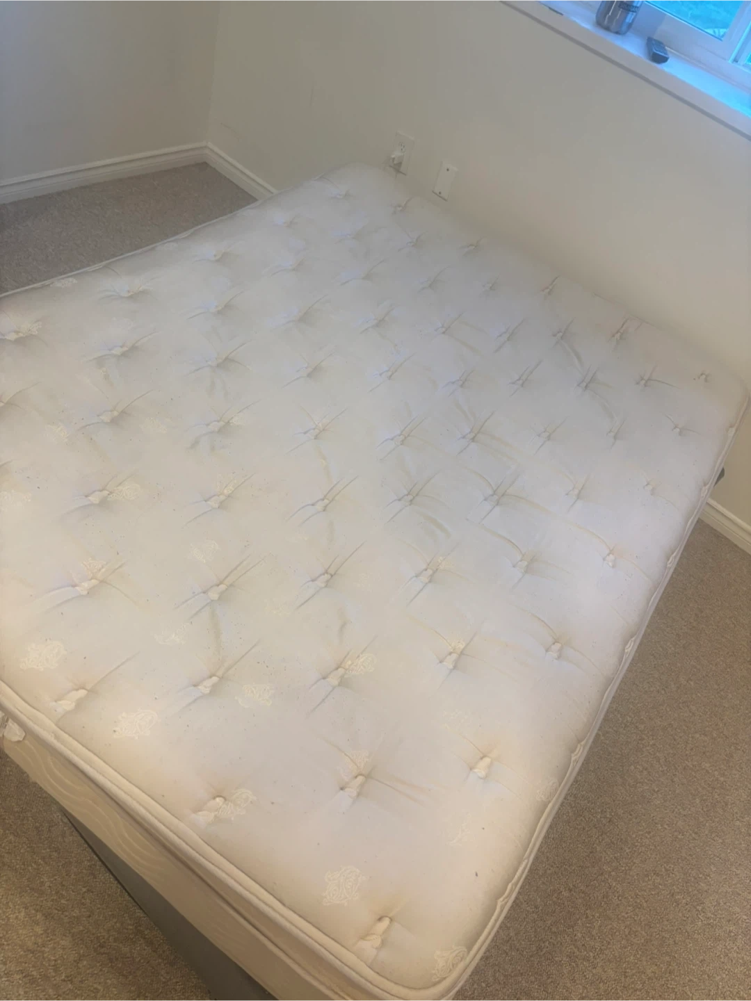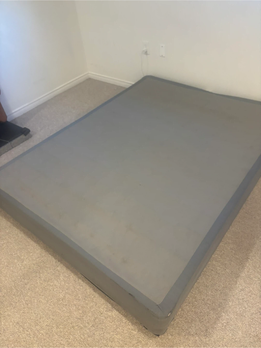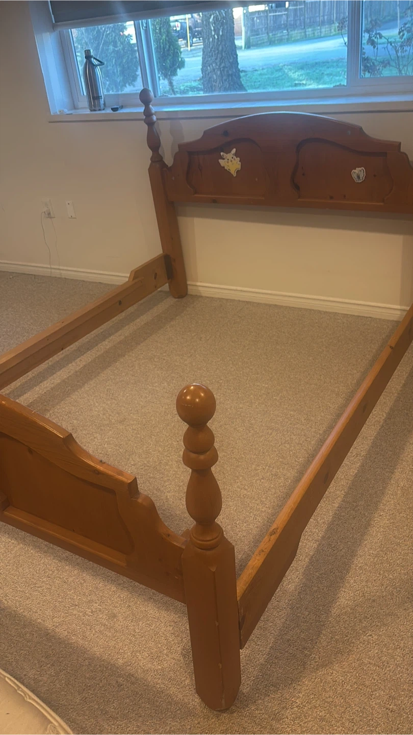 Wooden bed frame with a classic design. Includes a box spring for mattress support. Solid wood construction. Suitable for a master bedroom or guest room.