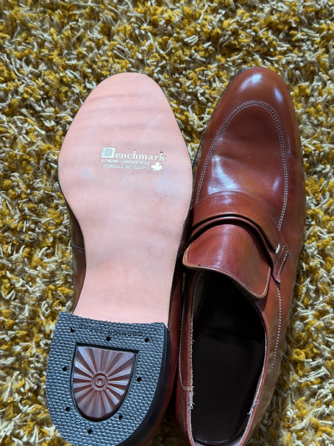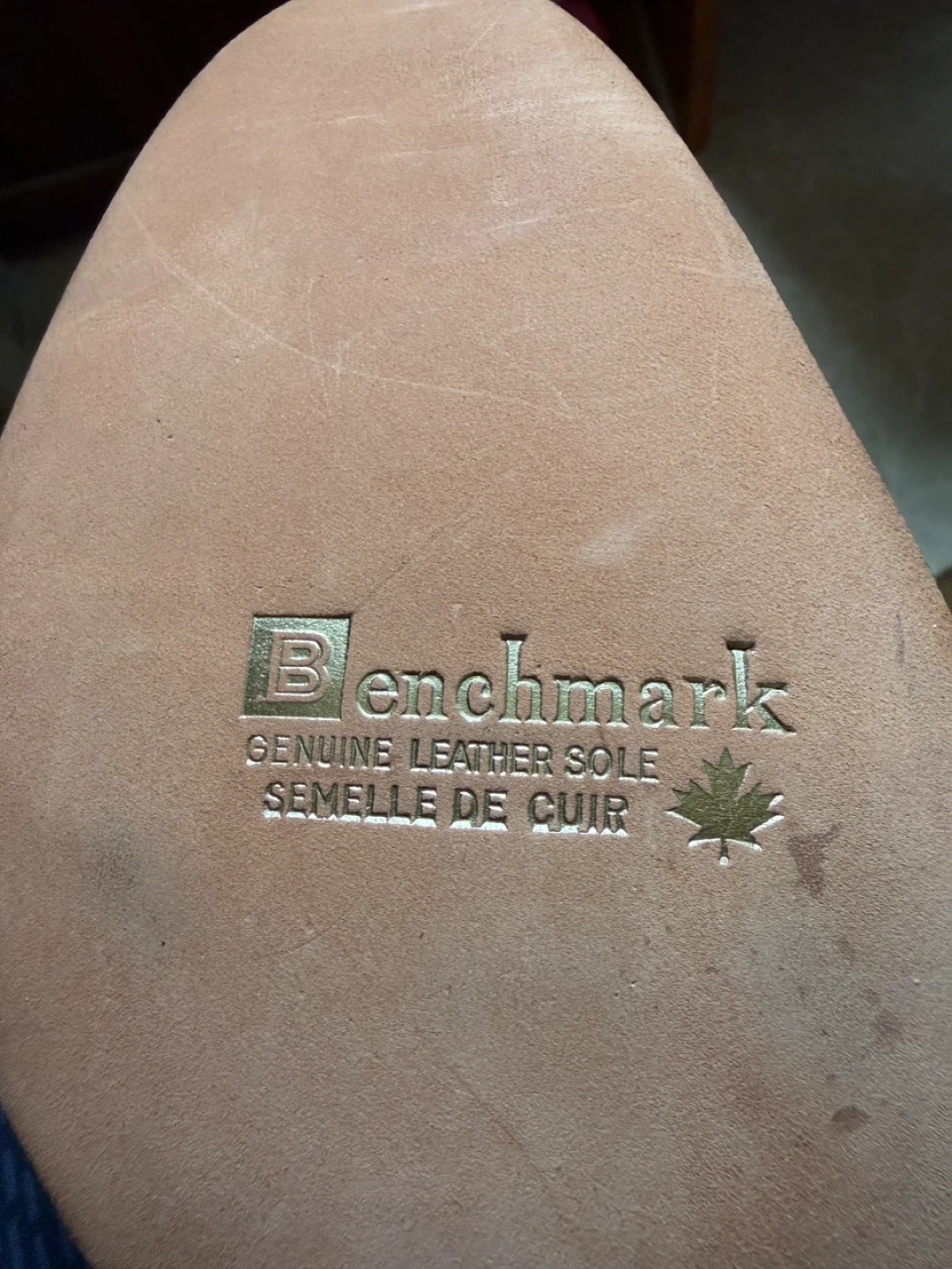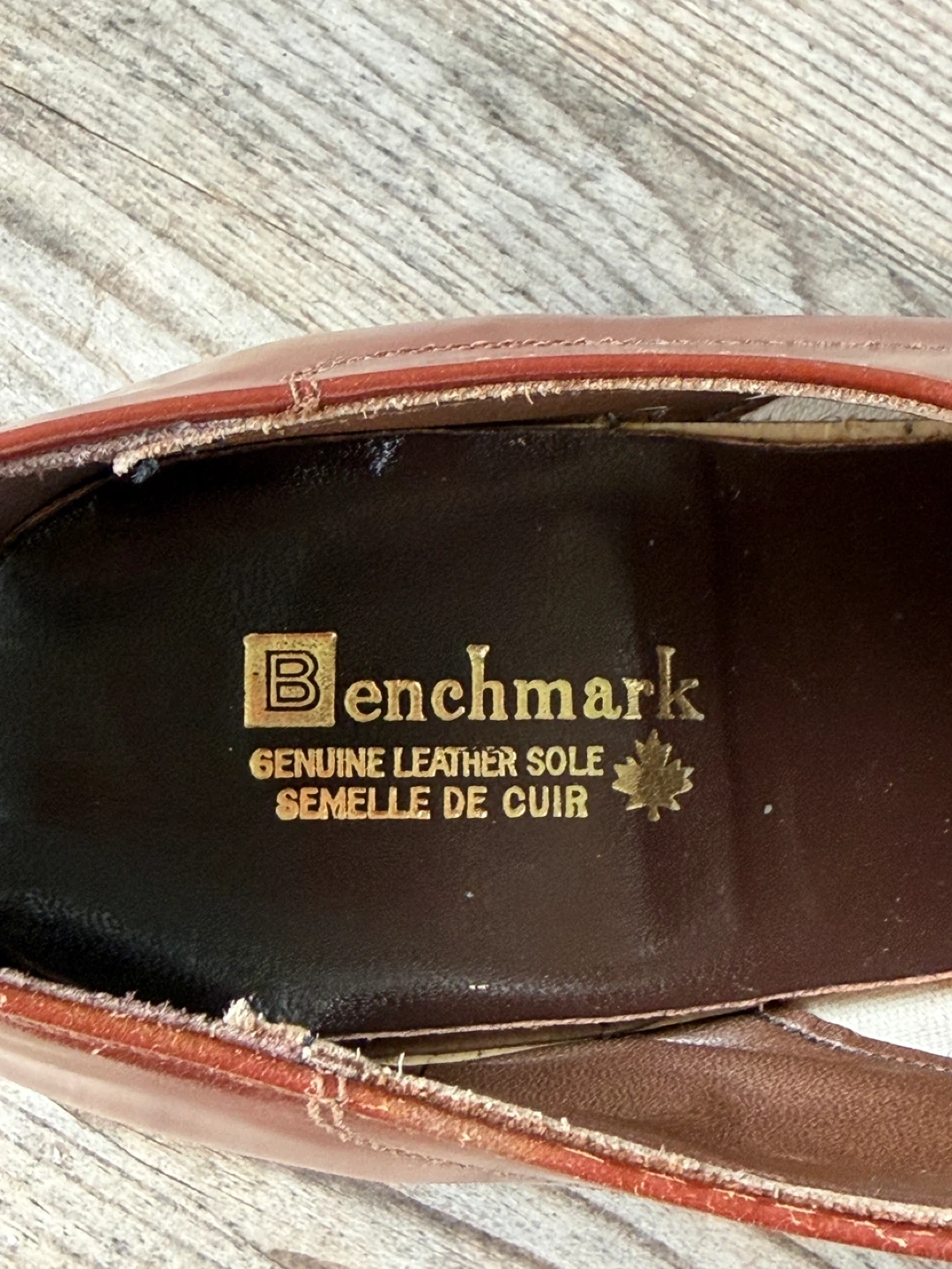 Men's Vintage leather loafer shoes from Canada by Benchmark. The writing on the inside says 12 D and very expensive. I have researched extensively and cannot find the exact shoe anywhere.