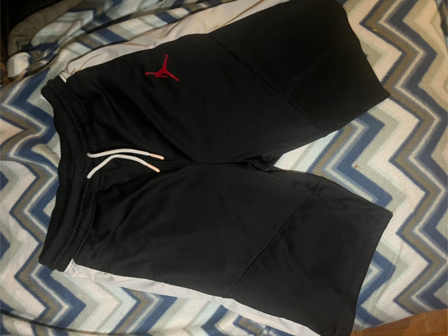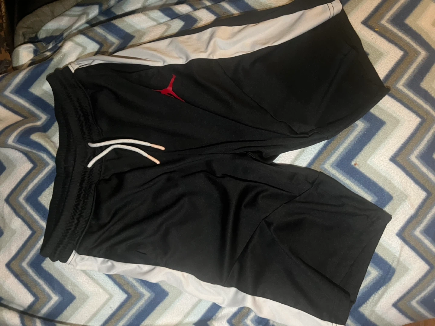 Black Jordan basketball shorts with white drawstring and grey side panels. Features the Jumpman logo. Dri-FIT technology for moisture management.