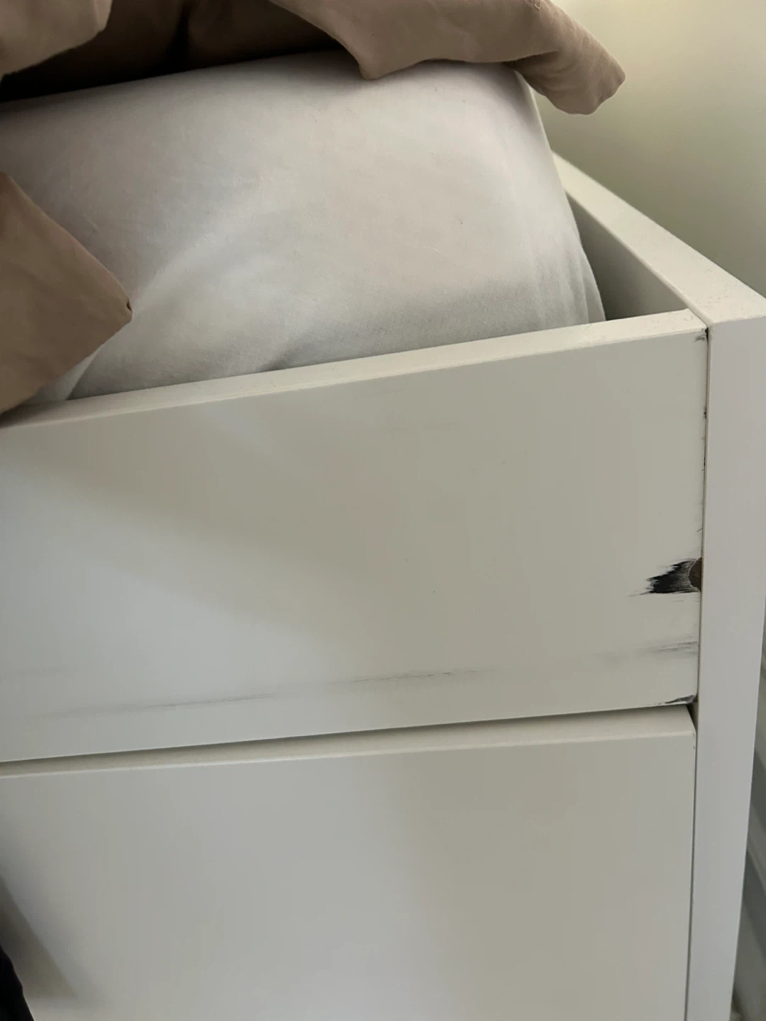 • One cosmetic mark on the upper right panel from moving (paint chip + light scuff – see photo). This is the only visible mark and the panel can be placed on the opposite side if preferred.