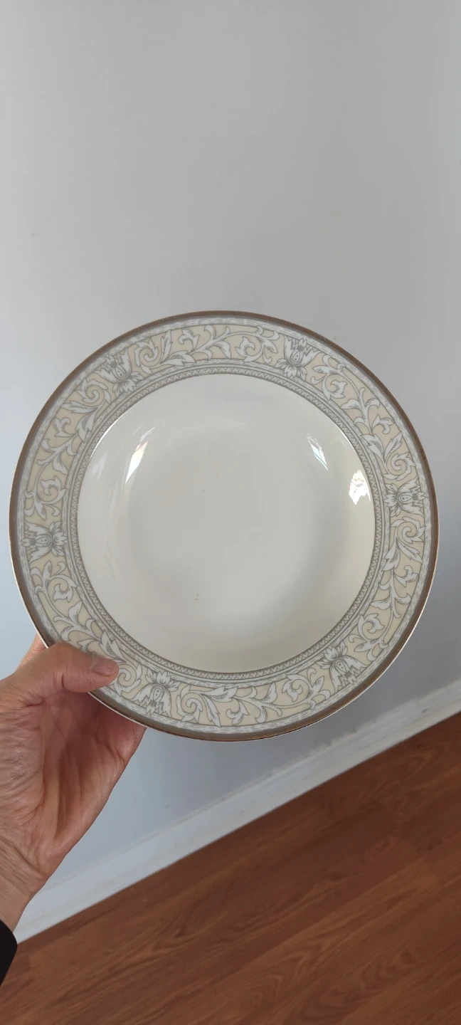 A pair of elegant soup bowls from Joshua Maxwell Studio, Cambridge pattern. These ceramic bowls feature a classic cream base with a detailed border. Dishwasher safe.