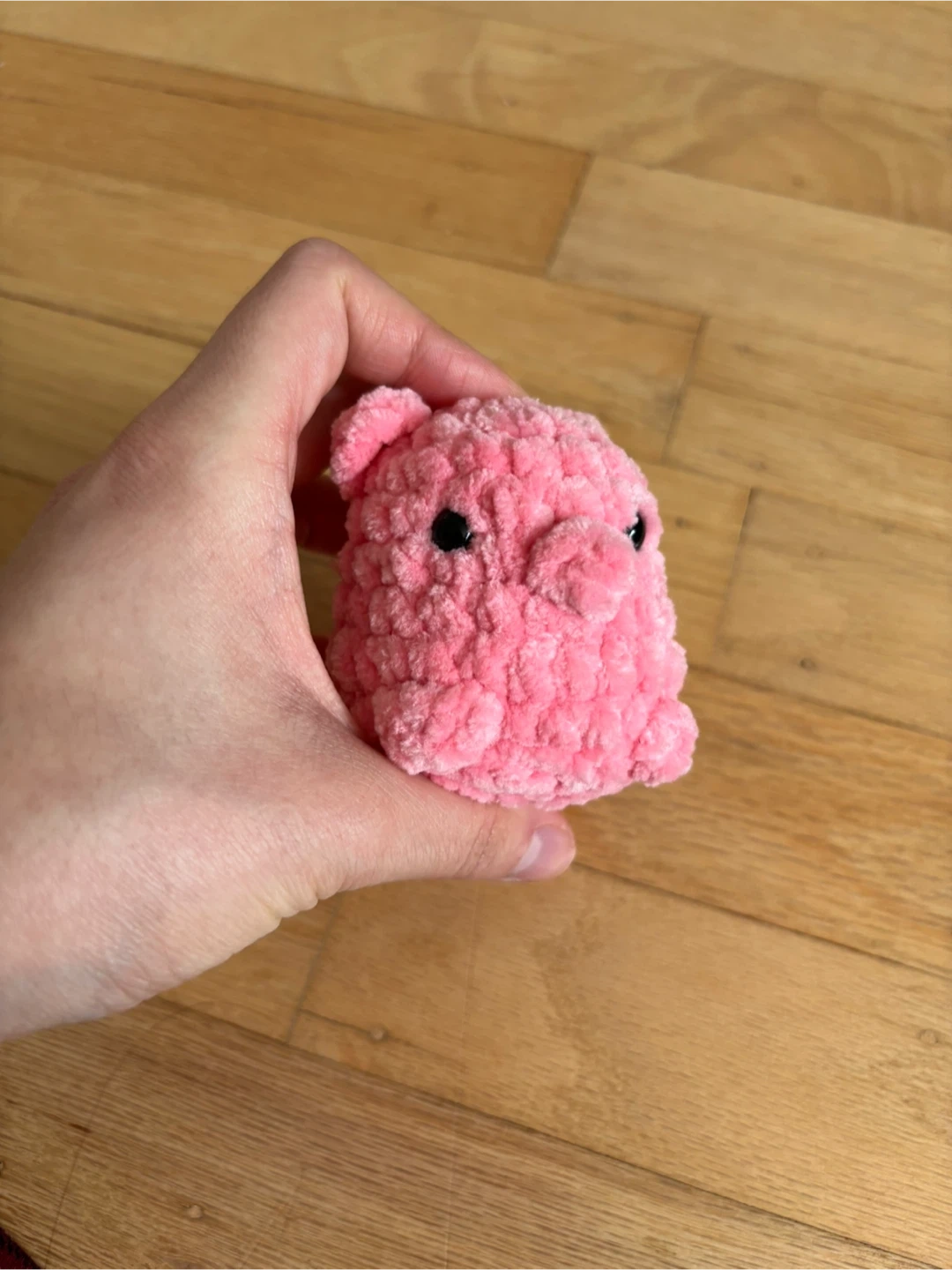 This is a cute, handmade crocheted pig toy. It's made from soft, chenille-style yarn and has black safety eyes. It's small enough to fit in your hand, perfect for a little desk buddy or a whimsical decoration. It's a lovely, plush pink colour!