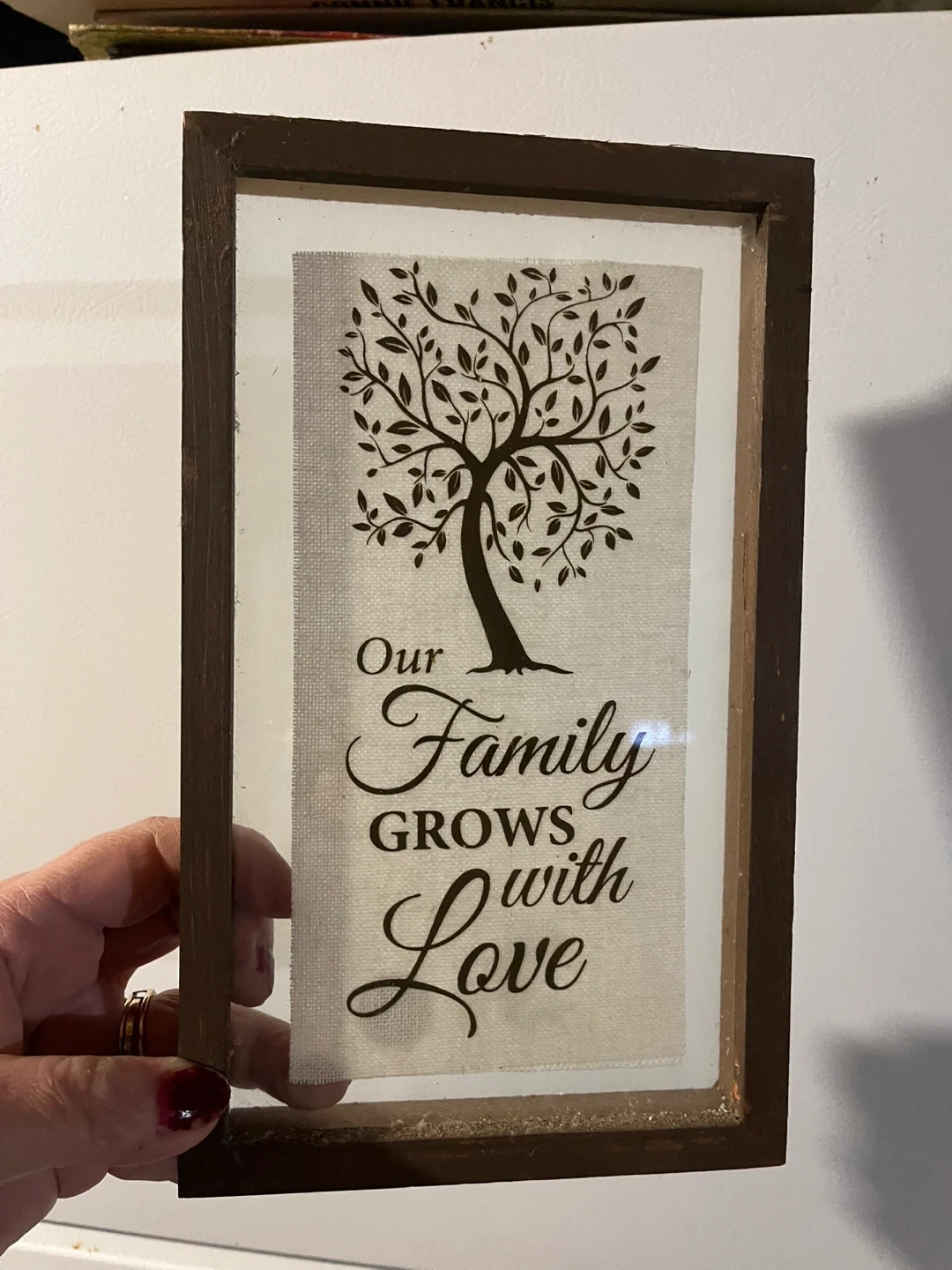 This framed wall art features a "Our Family Grows with Love" quote with a tree design. The frame is made of dark wood and the insert is a fabric material. It's a nice decorative piece for any home!