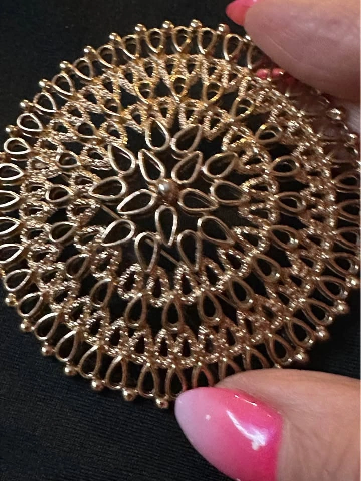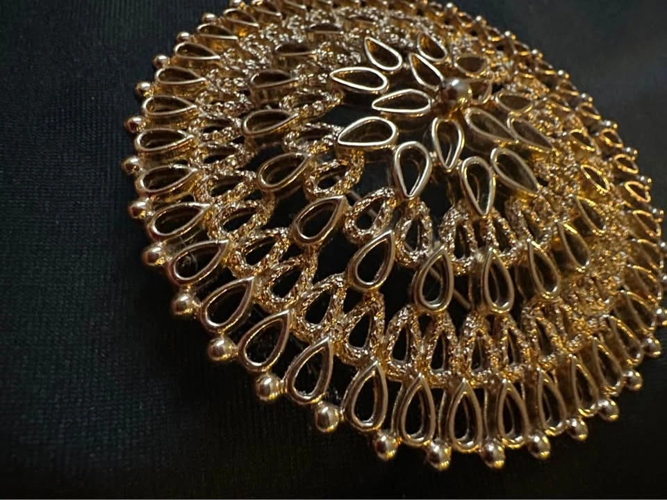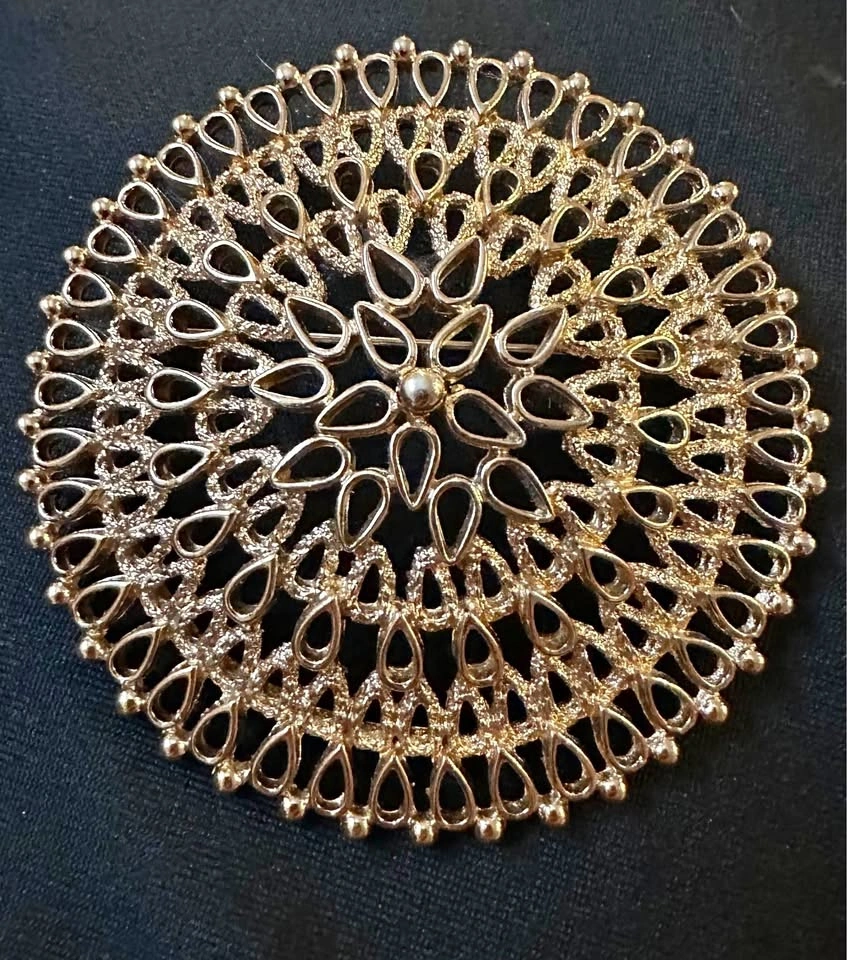 This is a stunning large gold medallion brooch, signed on the back by Sarah Coventry circa the 1960’s, made in Canada.