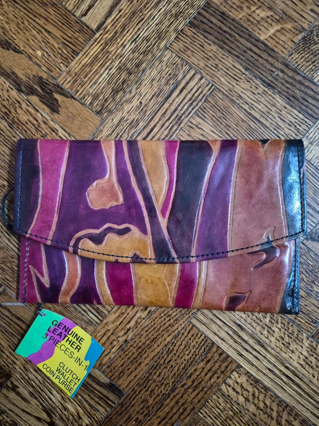 This set includes a clutch wallet and a matching coin purse. Both are made from genuine leather with a colourful abstract pattern. The wallet has a zip compartment inside.