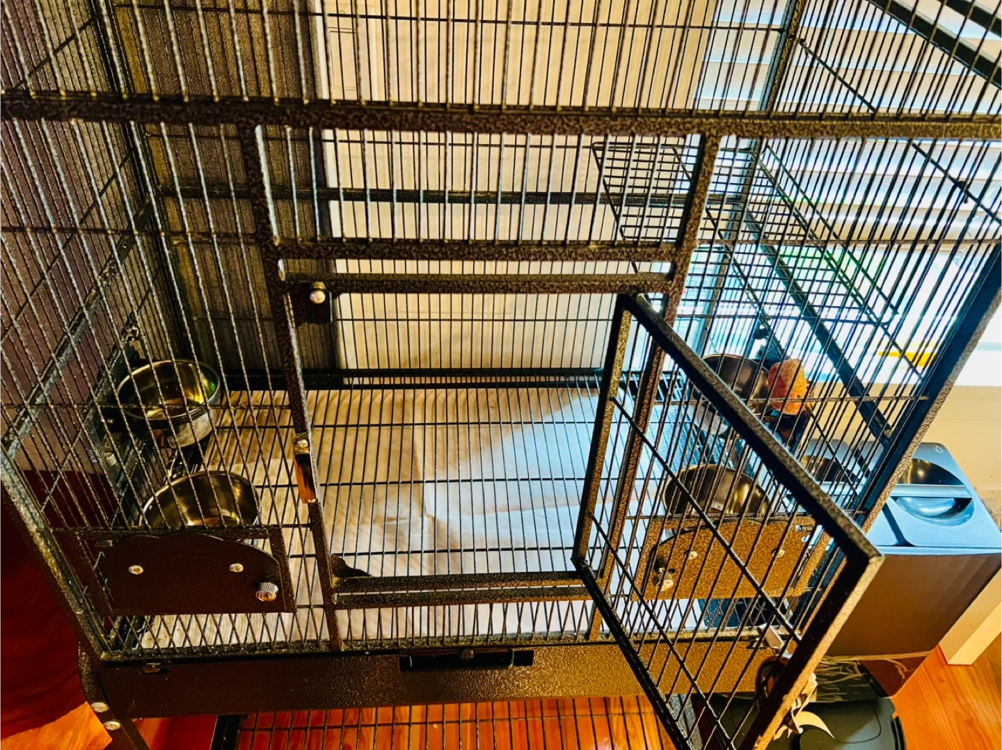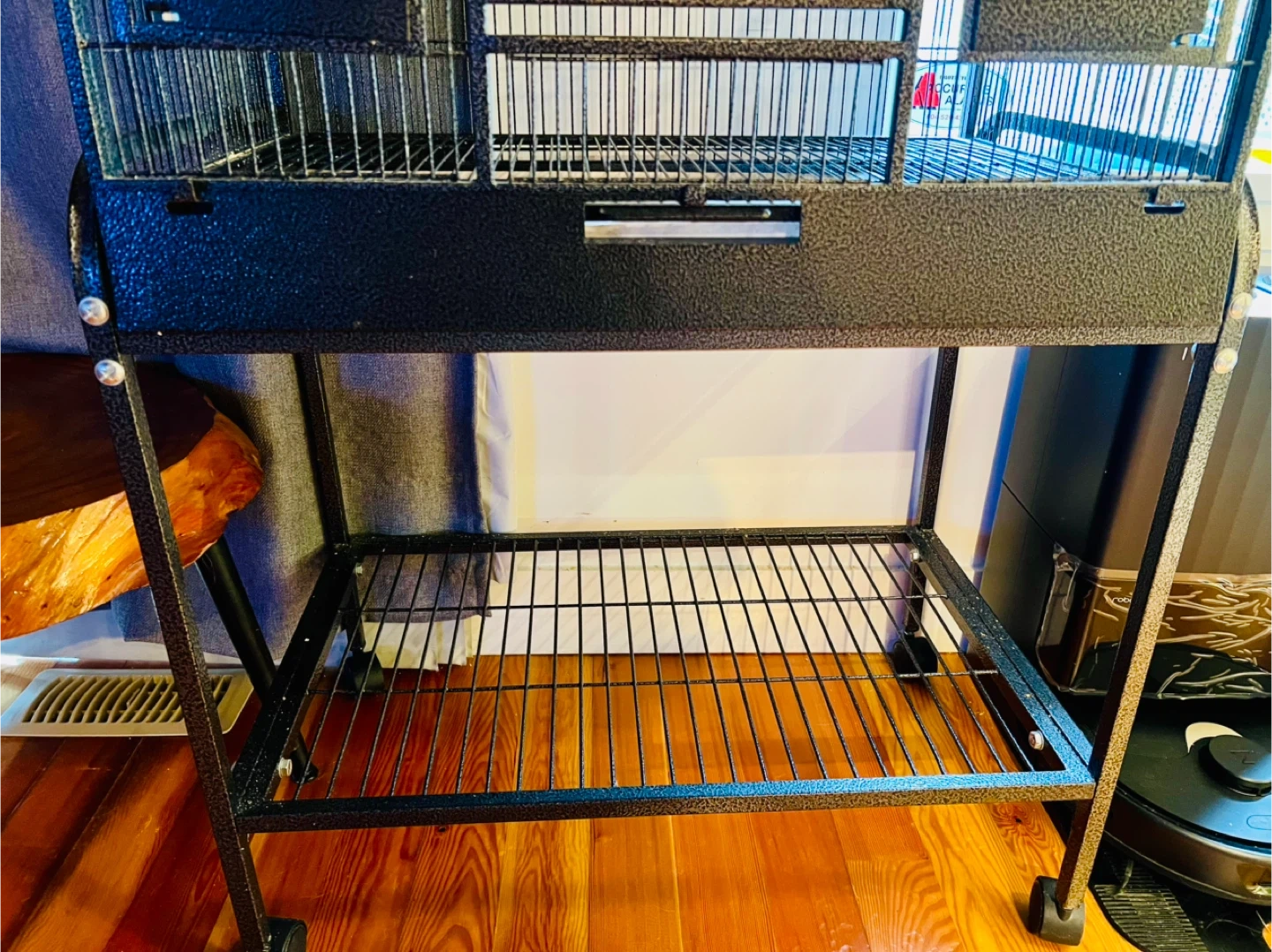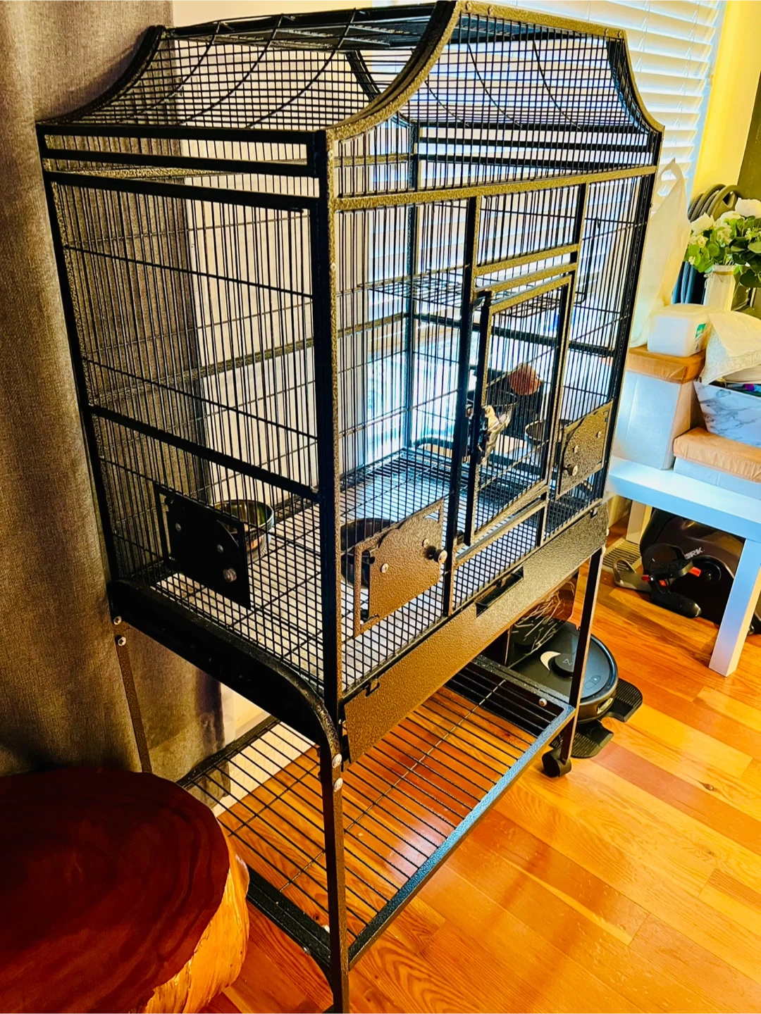 Spacious bird cage with a decorative arched top and a convenient stand. It includes feeders and perches inside. Features multiple doors for easy access. The bottom shelf provides extra storage. This cage is perfect for small to medium-sized birds.
