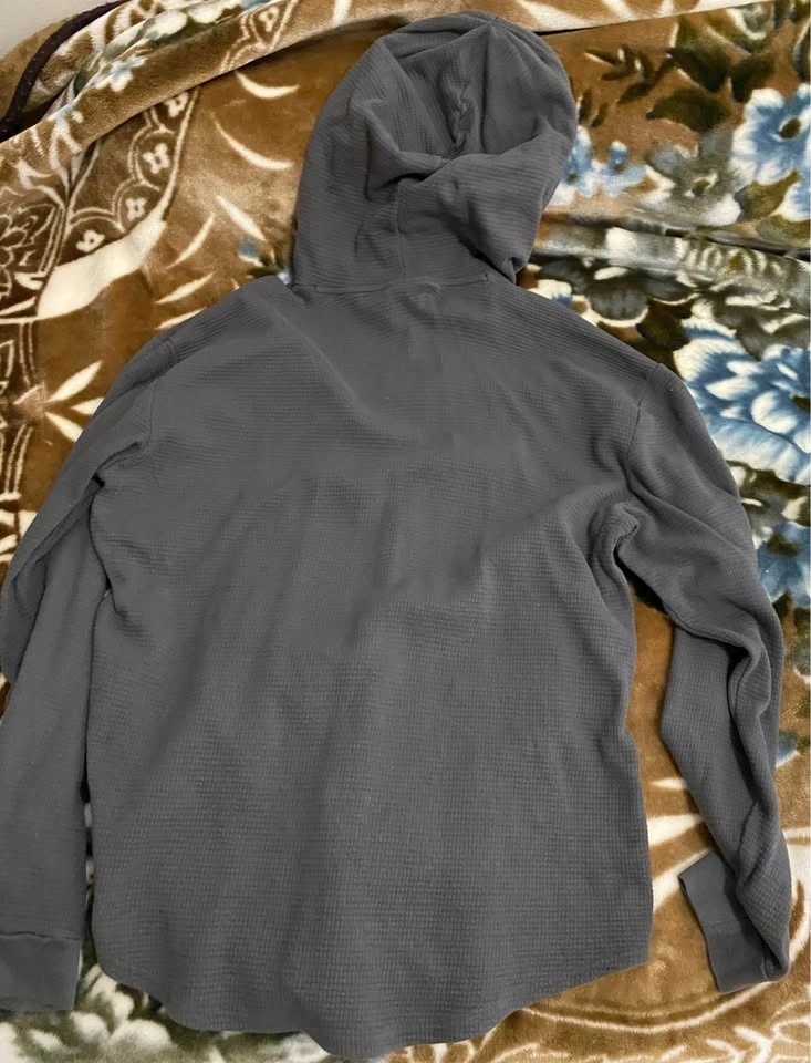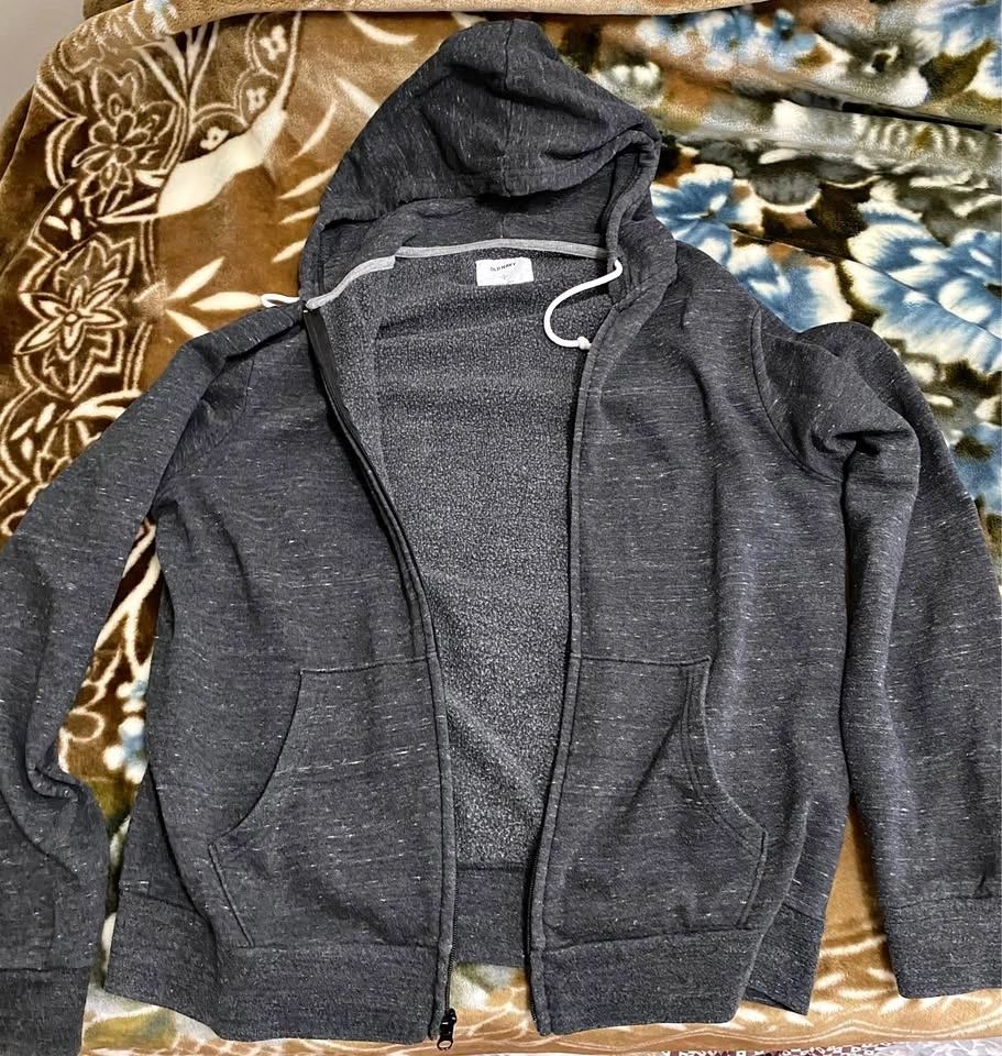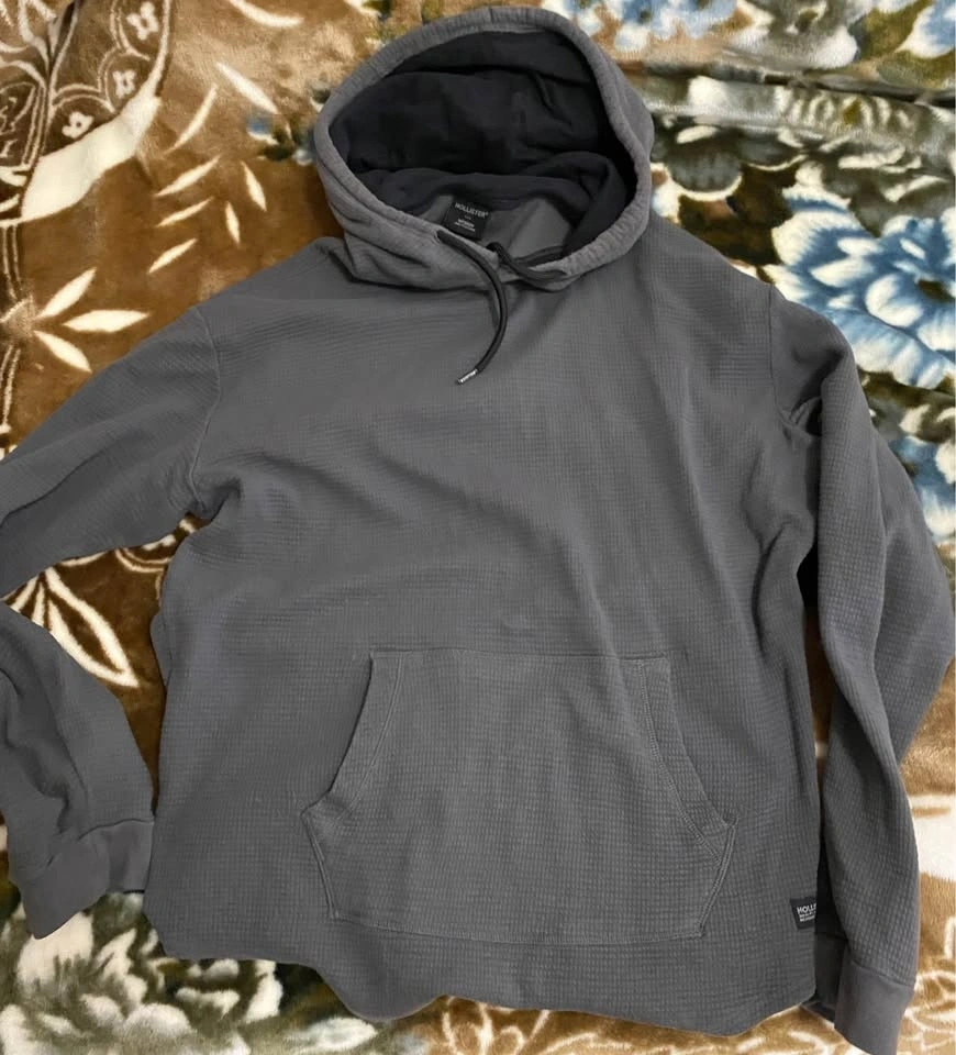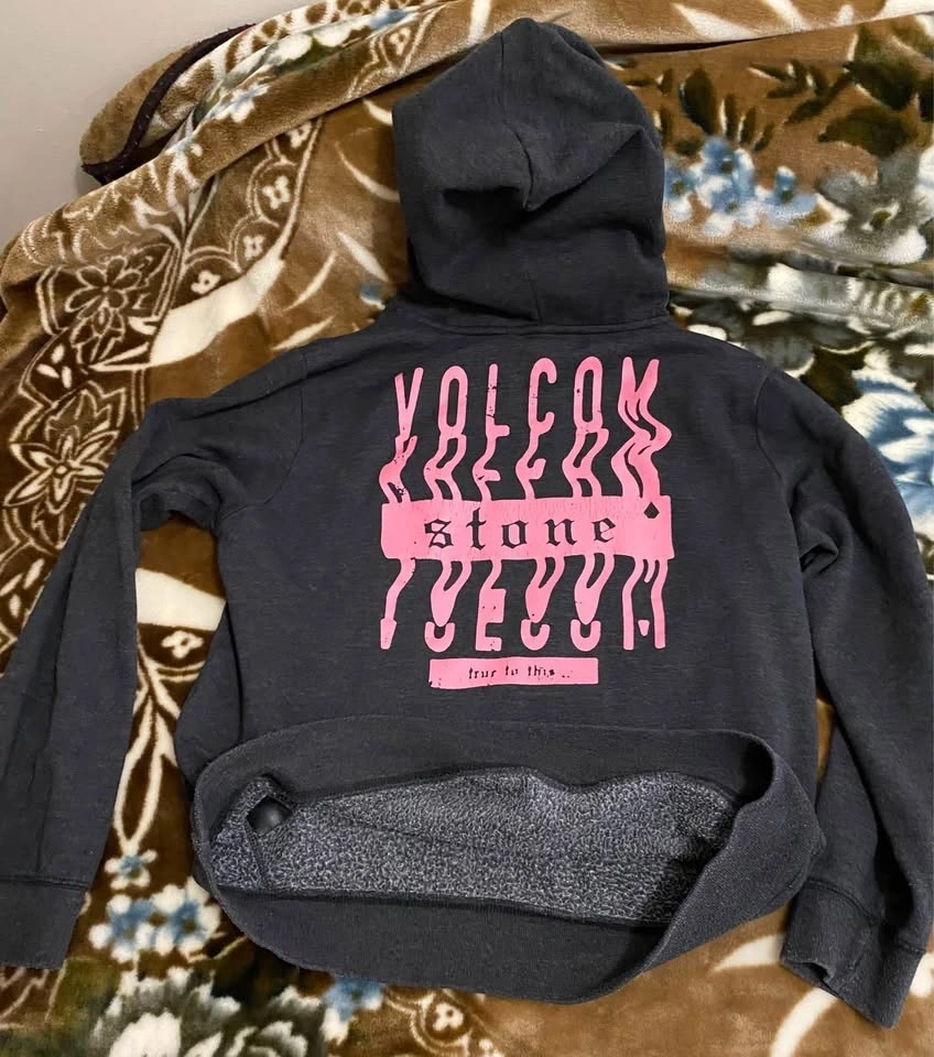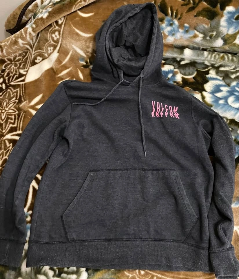 Comfortable pair of hoodies. Includes one dark charcoal grey zip-up hoodie from Old Navy and one black pullover hoodie from Volcom. Volcom hoodie has a pink graphic on the front chest and a large matching pink 'Volcom Stone' graphic on the back. Both have front pockets and adjustable drawstrings. Hollister gray hoodie. Used hoodies in good condition. Size L & M. $10 each. Buy 2 for $15. Buy 3 for $20