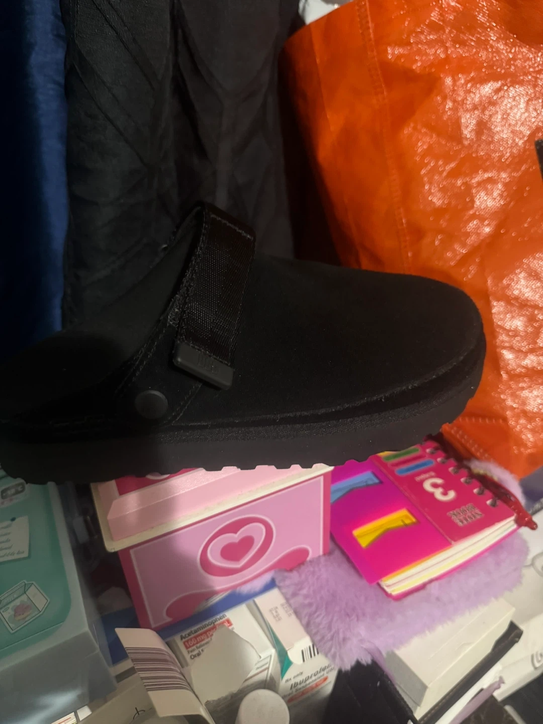 These are black clog shoes with a fuzzy lining. They have an adjustable heel strap for a secure fit. Comfortable for everyday wear!ugg